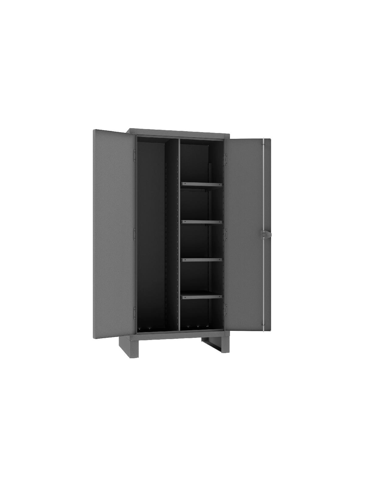 Feature rugged, all-welded 12 ga. steel construction and handsome flush door design. 4 reinforced steel shelves are adjustable on 2-1/2” centers. Includes extra heavy-duty hinge pins that secure doors to avoid sagging. Sturdy 3-point, cast steel locking handles have 3/8” dia. rods and provision for padlock (padlock not furnished).  6" high box style legs offer space for lift truck forks and can be lagged to the floor, constructed of 3/16" steel. Durable Gray powder coat finish. FOB Shipping Point.