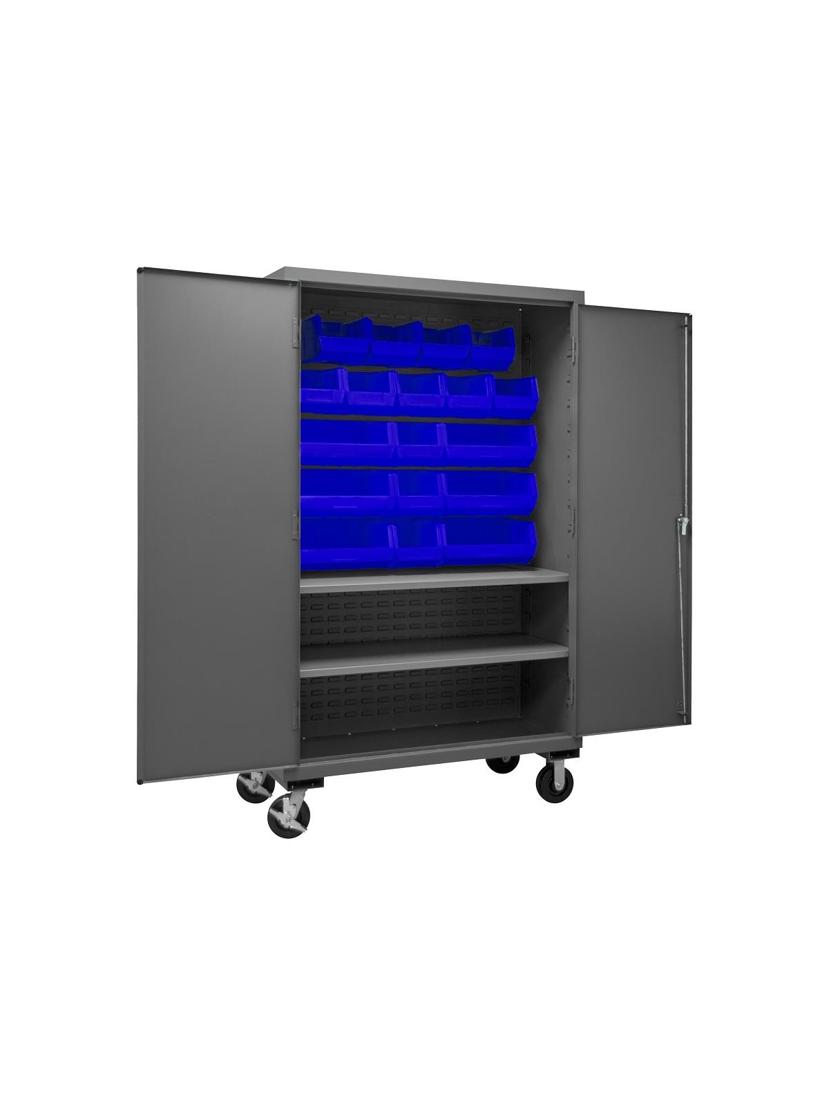 Heavy duty, all welded 14-gauge steel with 6" x 2" phenolic casters (2 rigid, 2 locking swivel). 3-point locking system with keyed handle and lock rods, 4 keys included. Side handle for easy maneuvering. Fully welded louvered panels reinforce back and hold Hook-On-Bins® and adjustable shelves rest on louvered panels and adjust on 4"centers. No tools required for installation. Hook-On-Bins® by Durham are included and install with no tools required. Gray textured powder coat finish. Available in three bin colors, Red (-1795), Blue (-5295), or Yellow (-95). FOB Shipping Point.