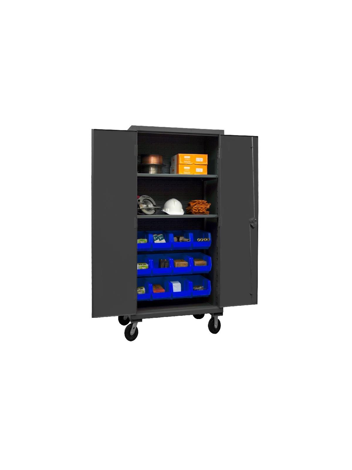 Heavy duty, all welded 12-gauge steel with 6" x 2" phenolic casters (2 rigid, 2 locking swivel). 3-point locking system with keyed handle and lock rods, 4 keys included. Side handle for easy maneuvering. Fully welded louvered panels reinforce back and hold Hook-On-Bins®. Shelves bolt into place easily using fasteners provided and adjust on 2-1/4" centers. No tools required for installation.  Hook-On-Bins® by Durham are included and install with no tools required. Gray textured powder coat finish. Available in three bin colors, Red (-1795), Blue (-5295), or Yellow (-95). FOB Shipping Point.