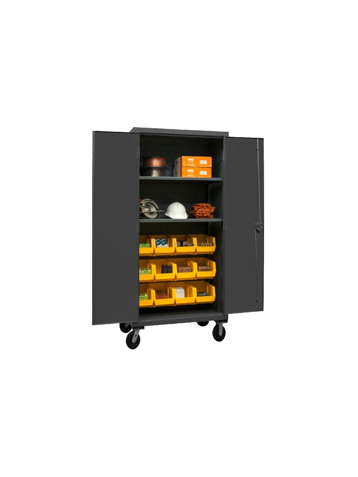Heavy duty, all welded 12-gauge steel with 6" x 2" phenolic casters (2 rigid, 2 locking swivel). 3-point locking system with keyed handle and lock rods, 4 keys included. Side handle for easy maneuvering. Fully welded louvered panels reinforce back and hold Hook-On-Bins®. Shelves bolt into place easily using fasteners provided and adjust on 2-1/4" centers. No tools required for installation.  Hook-On-Bins® by Durham are included and install with no tools required. Gray textured powder coat finish. Available in three bin colors, Red (-1795), Blue (-5295), or Yellow (-95). FOB Shipping Point.