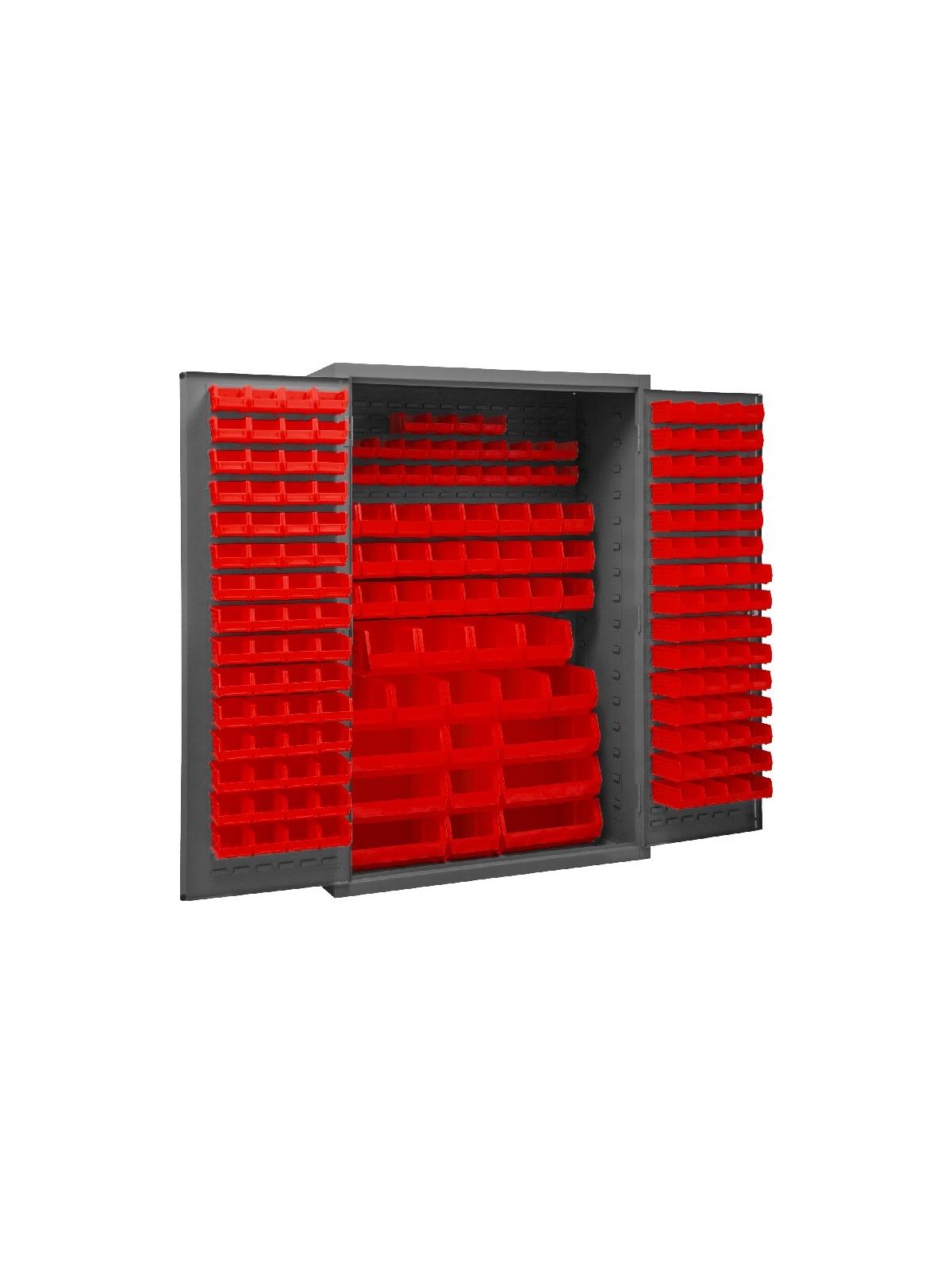 3-point locking system with keyed handle and lock rods, 4 keys included. Full height, formed and recessed doors with heavy duty, leaf hinges to prevent sagging and warping. Fully welded louvered panels reinforce door and accommodates Hook-On-Bins®. Hook-On-Bins® installed easily with no tools required. Hook-On-Bins® are included. Durable, gray textured powder coat finish. Available in three bin colors, Red (-1795), Blue (-5295), or Yellow (-95). FOB Shipping Point.