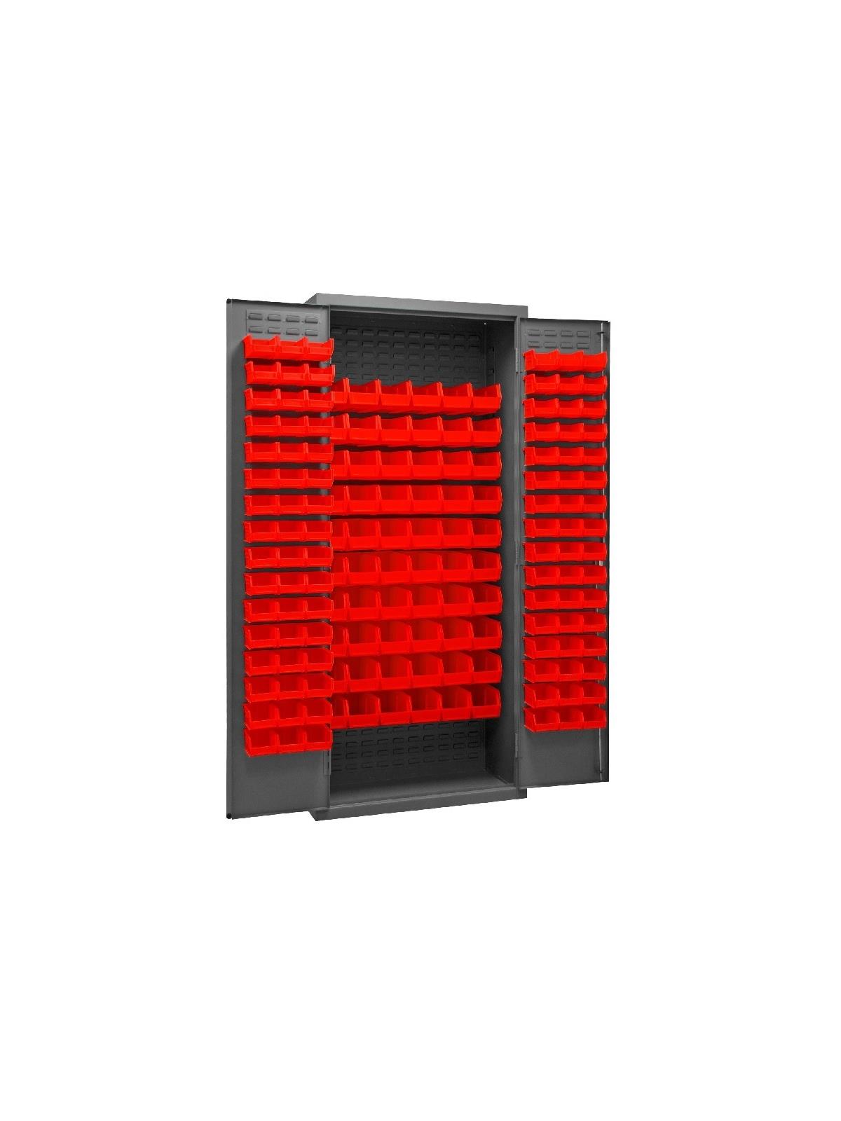 3-point locking system with keyed handle and lock rods, 4 keys included. Full height, formed and recessed doors with heavy duty, leaf hinges to prevent sagging and warping. Fully welded louvered panels reinforce door and accommodates Hook-On-Bins®. Hook-On-Bins® installed easily with no tools required. Hook-On-Bins® are included. Durable, gray textured powder coat finish. Available in three bin colors, Red (-1795), Blue (-5295), or Yellow (-95). FOB Shipping Point.