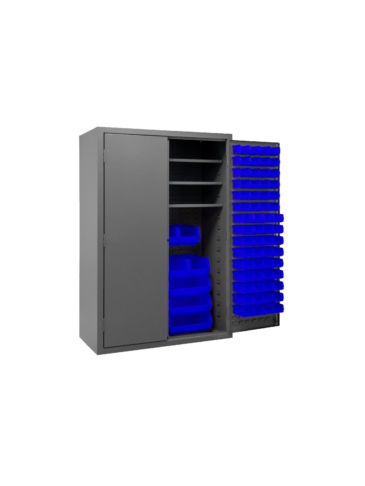 3-point locking system with keyed handle and lock rods, 4 keys included. Full height, formed and recessed doors with heavy duty, leaf hinges to prevent sagging and warping. Adjustable shelves rest on louvered panels and adjust on 4" centers. No tools required for installation. Fully welded louvered panels reinforce door and accommodate Hook-On Bins®. Hook-On Bins® installed easily with no tools required. Hook-On Bins® are included. Durable, gray, textured powder coat finish. Available in three bin colors, Red (-1795), Blue (-5295), or Yellow (-95). FOB Shipping Point.