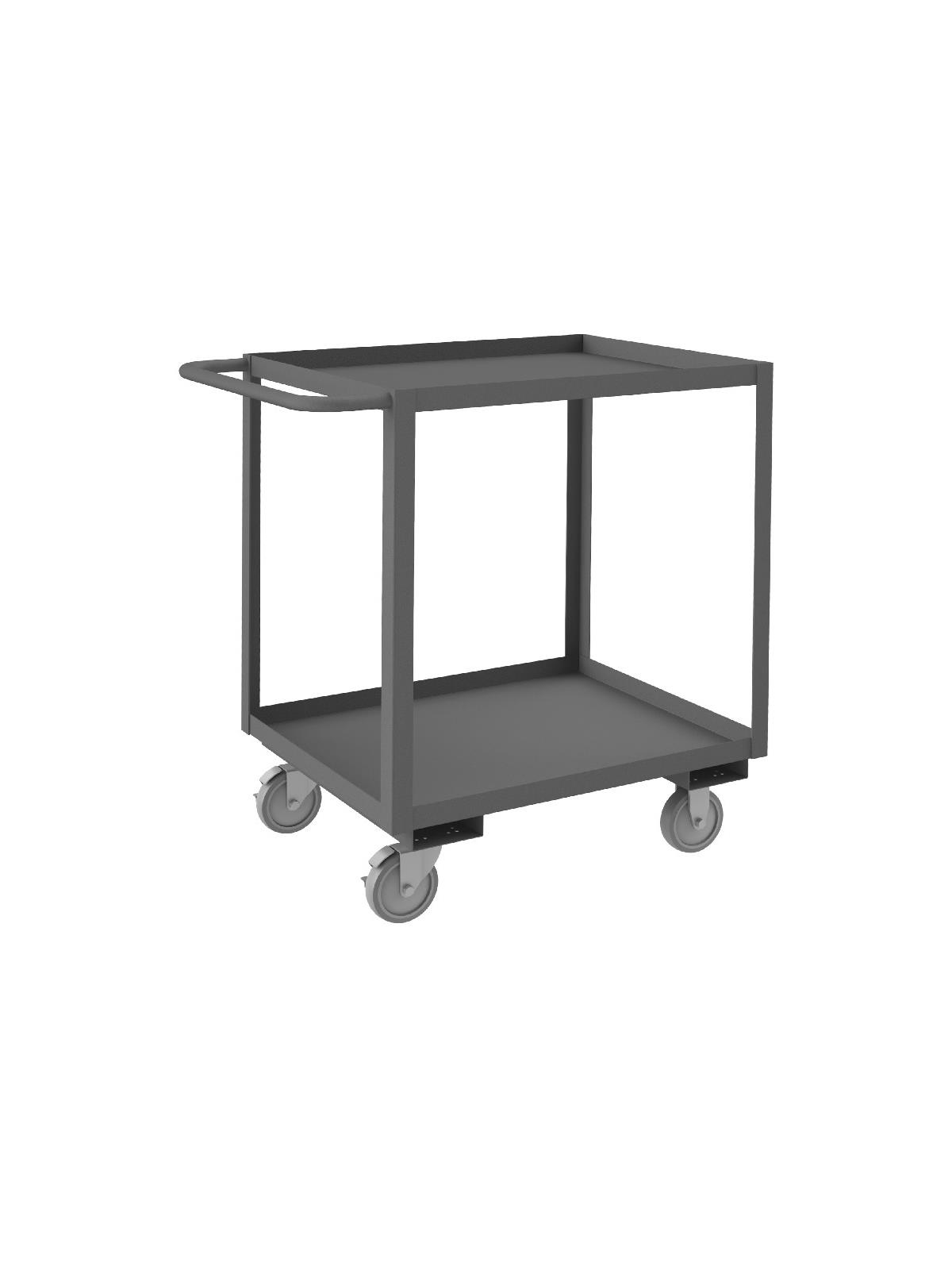 Shelf carts are constructed with 1-1/2" x 1/8" angle iron uprights for added strength. Heavy duty 14 gauge steel shelves. Sturdy tubular push handle. Perfect for transporting heavier parts or stock items. Shelf Stock Carts are available in 1,200 lbs. or 3,000 lbs. capacities. FOB Shipping Point.