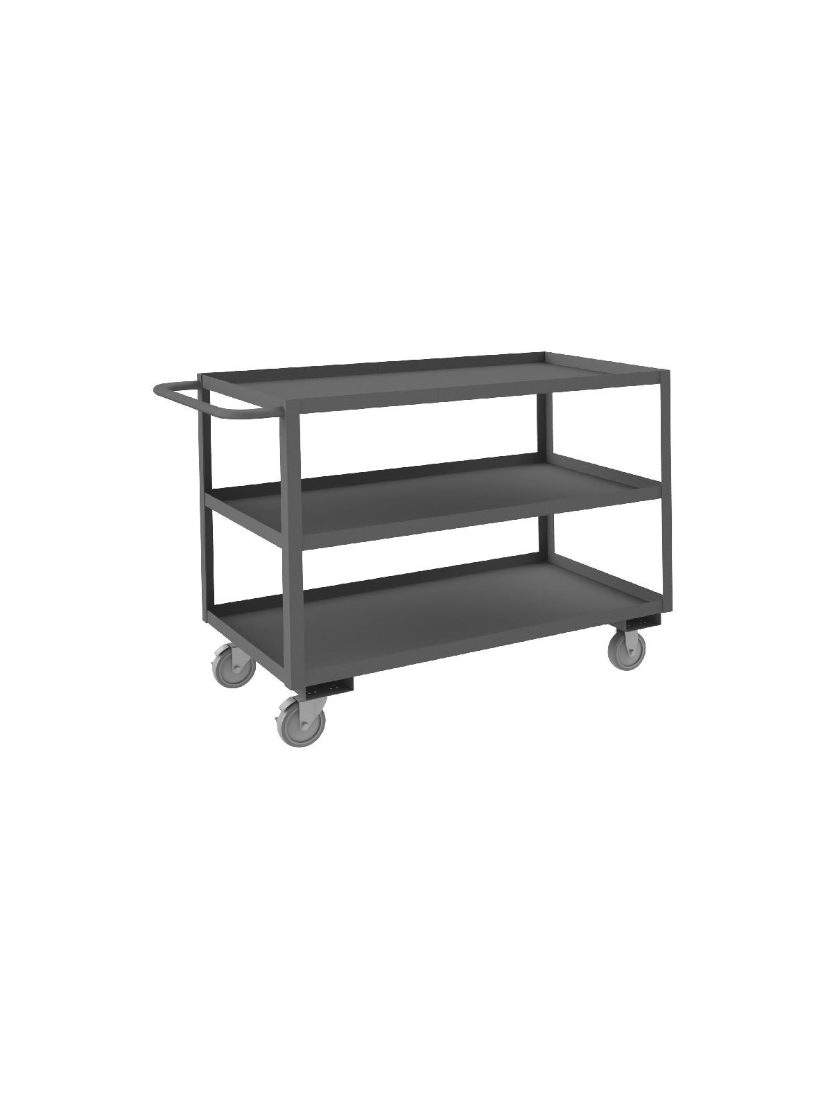 Shelf carts are constructed with 1-1/2" x 1/8" angle iron uprights for added strength. Heavy duty 14 gauge steel shelves. Sturdy tubular push handle. Perfect for transporting heavier parts or stock items. Shelf Stock Carts are available in 1,200 lbs. or 3,000 lbs. capacities. FOB Shipping Point.