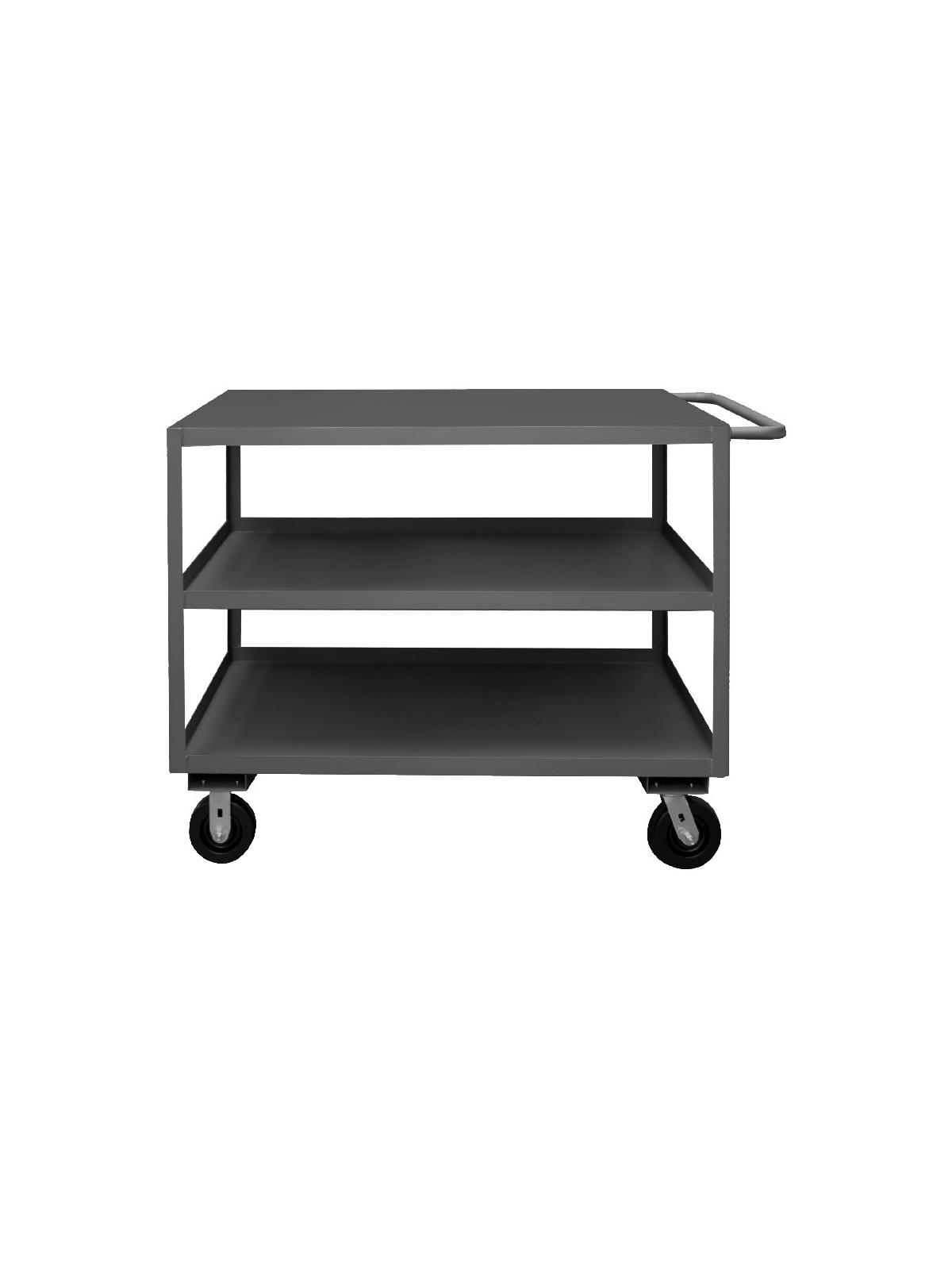 Shelf carts are constructed with 1-1/2" x 1/8" angle iron uprights for added strength. Heavy duty 14 gauge steel shelves. Sturdy tubular push handle. Perfect for transporting heavier parts or stock items. Shelf Stock Carts are available in 1,200 lbs. or 3,000 lbs. capacities. FOB Shipping Point.