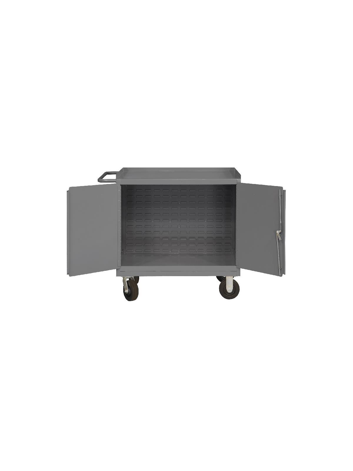 Made of heavy duty 16 ga. steel construction. Convenient sturdy work surface with back stop. Tubular push handle allows for ease of mobility. Rolls smoothly on 6" x 2" phenolic casters (2) swivel and (2) rigid. Back louvered panel accommodates Hook-On-Bins®. Doors lock securely with a 3 point locking handle and 4 keys. Durable, gray, textured powder coat finish. FOB Shipping Point.