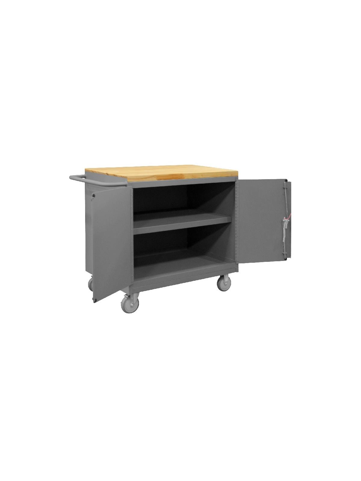 Bench cabinets are constructed of 14 gauge steel. Convenient sturdy work surface with back and end stops on the work surface prevents parts from falling off during transport (MT units not included). Tubular handle for easy maneuverability. Cabinet doors have a 3 point locking system with 4 keys. Rolls smoothly on 5" polyurethane bolt-on casters, (2) swivel with side brakes and (2) rigid. 36"W model has 1,200 lbs. capacity. 48"W model has 2,000 lbs. capacity and includes a floor lock to keep the unit in place while you work. FOB Shipping Point.