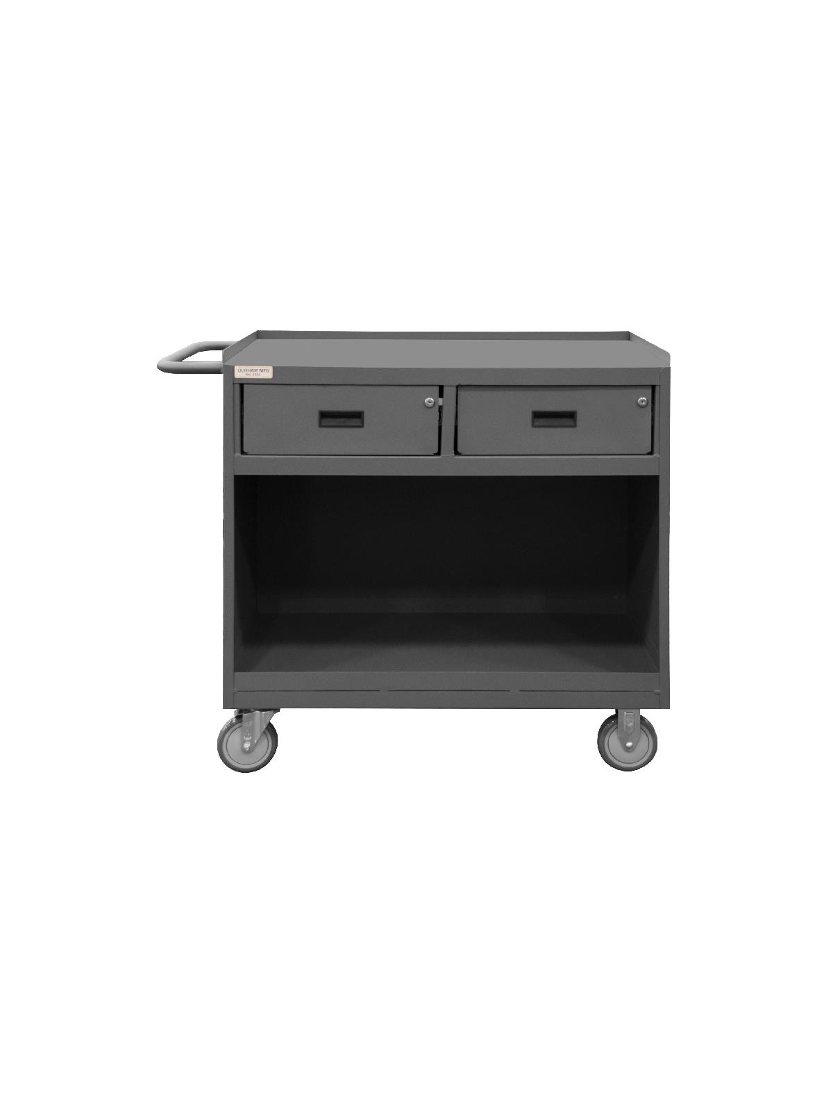 Bench cabinets are constructed of 14 gauge steel. Convenient sturdy work surface with back and end stops on the work surface prevents parts from falling off during transport (MT units not included). Tubular handle for easy maneuverability. Cabinet doors have a 3 point locking system with 4 keys. Rolls smoothly on 5" polyurethane bolt-on casters, (2) swivel with side brakes and (2) rigid. 36"W model has 1,200 lbs. capacity. 48"W model has 2,000 lbs. capacity and includes a floor lock to keep the unit in place while you work. FOB Shipping Point.