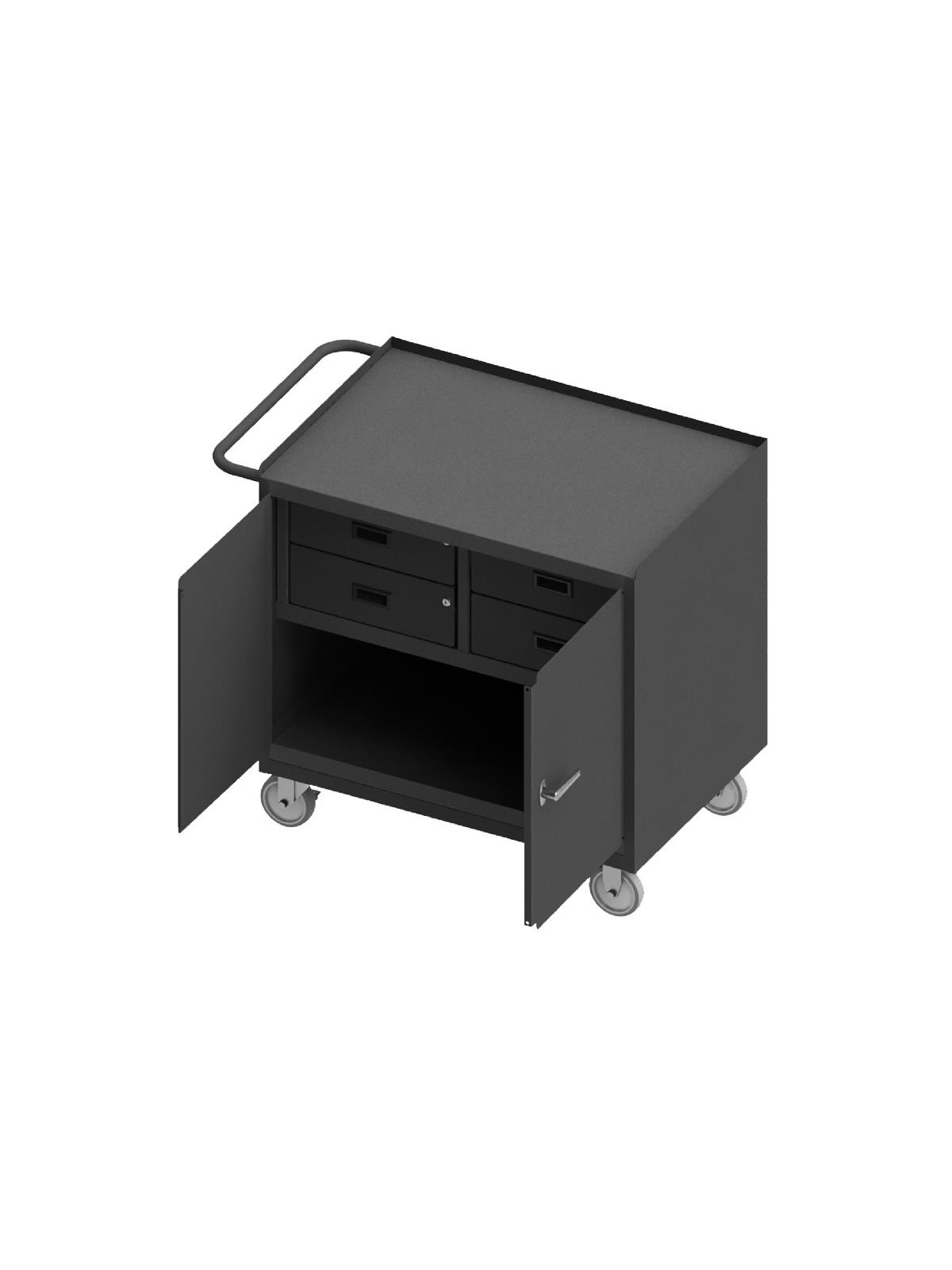 Bench cabinets are constructed of 14 gauge steel. Convenient sturdy work surface with back and end stops on the work surface prevents parts from falling off during transport (MT units not included). Tubular handle for easy maneuverability. Cabinet doors have a 3 point locking system with 4 keys. Rolls smoothly on 5" polyurethane bolt-on casters, (2) swivel with side brakes and (2) rigid. 36"W model has 1,200 lbs. capacity. 48"W model has 2,000 lbs. capacity and includes a floor lock to keep the unit in place while you work. FOB Shipping Point.
