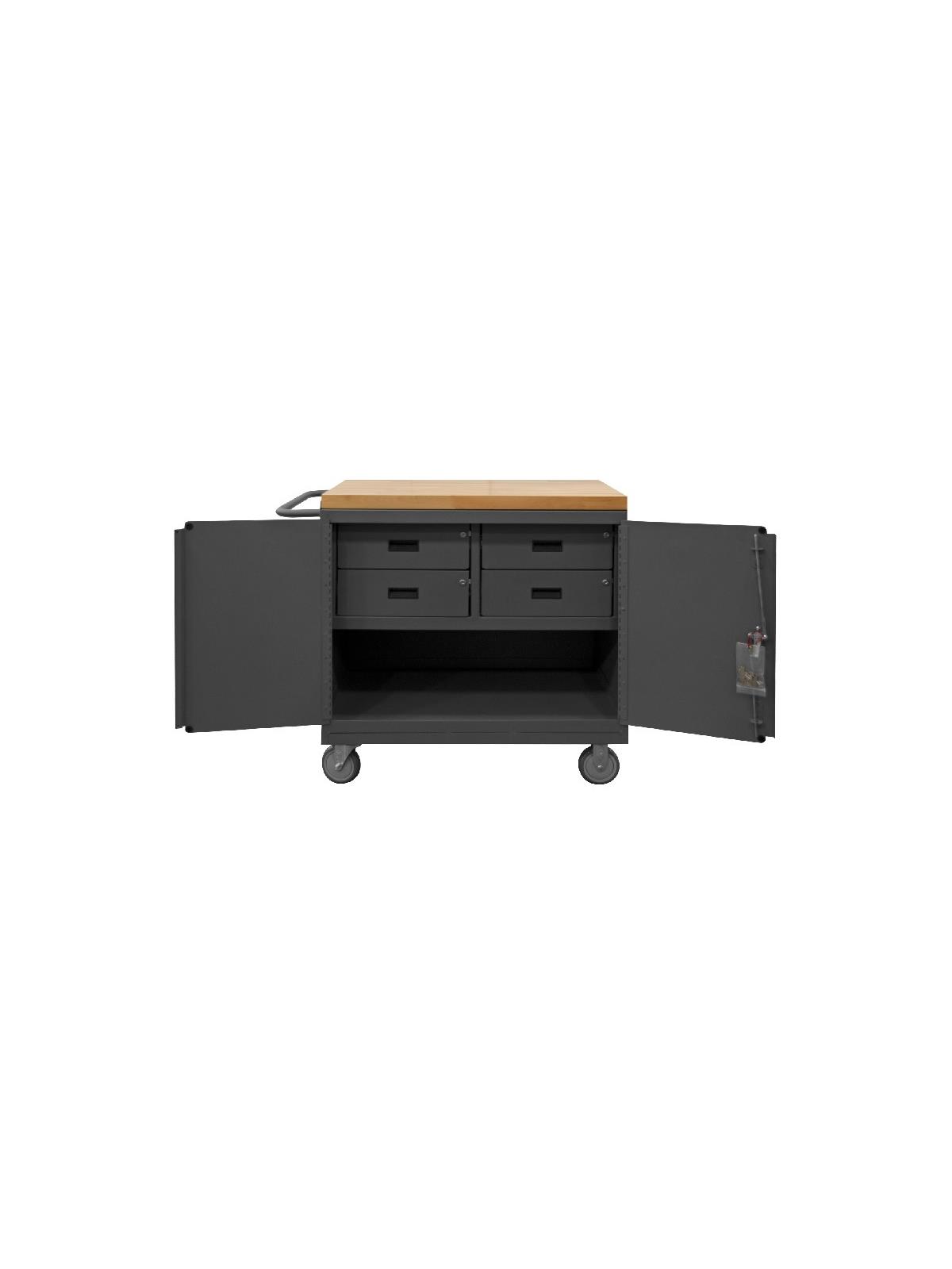 Bench cabinets are constructed of 14 gauge steel. Convenient sturdy work surface with back and end stops on the work surface prevents parts from falling off during transport (MT units not included). Tubular handle for easy maneuverability. Cabinet doors have a 3 point locking system with 4 keys. Rolls smoothly on 5" polyurethane bolt-on casters, (2) swivel with side brakes and (2) rigid. 36"W model has 1,200 lbs. capacity. 48"W model has 2,000 lbs. capacity and includes a floor lock to keep the unit in place while you work. FOB Shipping Point.