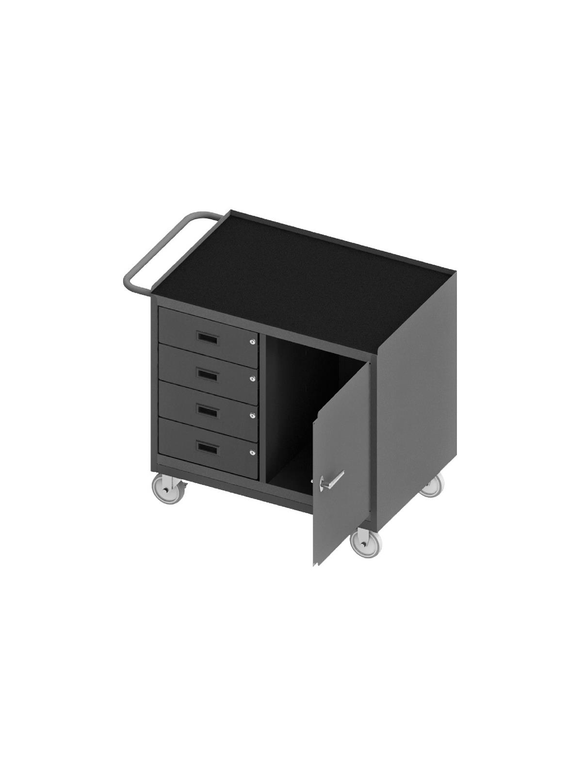Bench cabinets are constructed of 14 gauge steel. Convenient sturdy work surface with back and end stops on the work surface prevents parts from falling off during transport (MT units not included). Tubular handle for easy maneuverability. Cabinet doors have a 3 point locking system with 4 keys. Rolls smoothly on 5" polyurethane bolt-on casters, (2) swivel with side brakes and (2) rigid. 36"W model has 1,200 lbs. capacity. 48"W model has 2,000 lbs. capacity and includes a floor lock to keep the unit in place while you work. FOB Shipping Point.