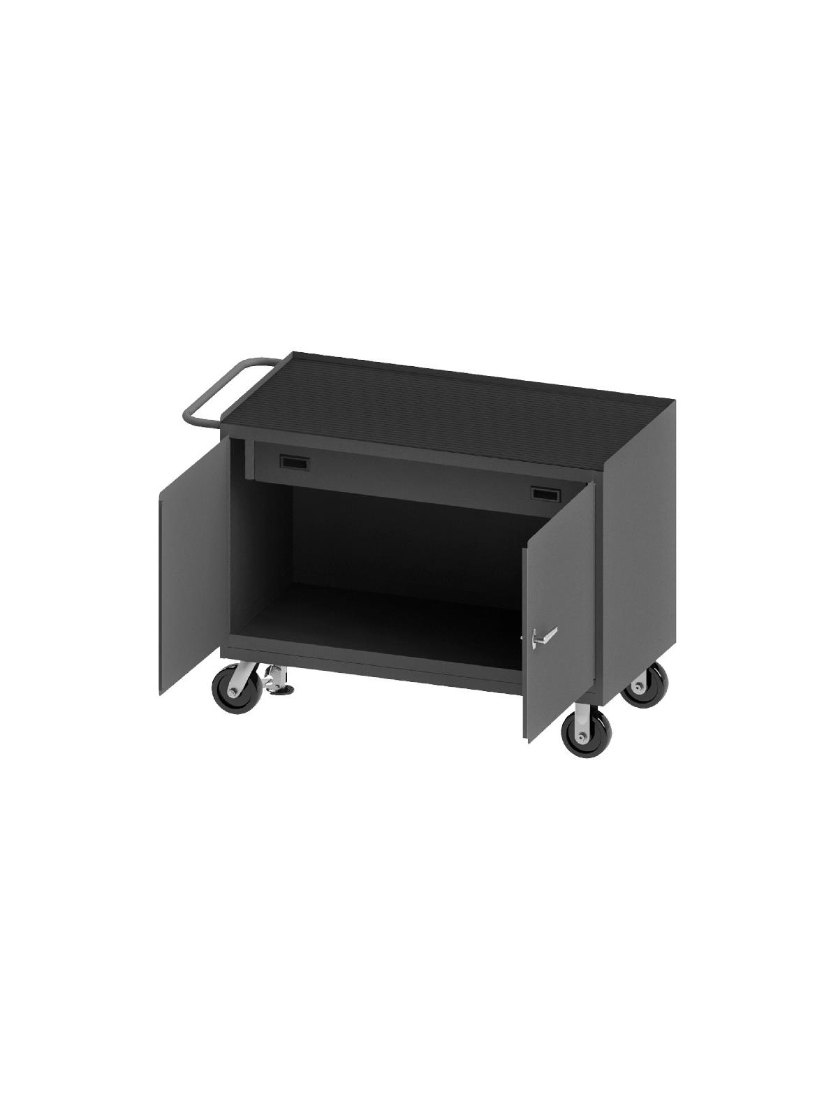 Bench cabinets are constructed of 14 gauge steel. Convenient sturdy work surface with back and end stops on the work surface prevents parts from falling off during transport (MT units not included). Tubular handle for easy maneuverability. Cabinet doors have a 3 point locking system with 4 keys. Rolls smoothly on 5" polyurethane bolt-on casters, (2) swivel with side brakes and (2) rigid. 36"W model has 1,200 lbs. capacity. 48"W model has 2,000 lbs. capacity and includes a floor lock to keep the unit in place while you work. FOB Shipping Point.