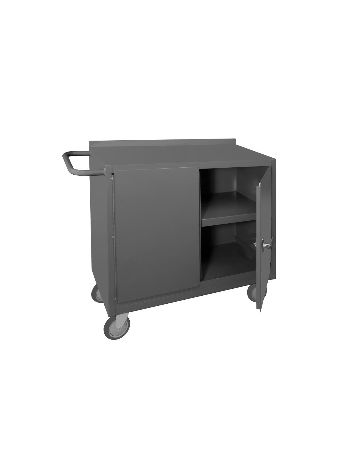 Use these rugged cabinets as maintenance or work stations on wheels. Built from heavy gauge steel for durability. Doors swing on full-piano hinge and single point locking handle. Ball bearing slide drawers (20-7/16"W x 14-11/16"D x 5-7/8"H) feature pull handle and keyed-alike cylinder lock. 3"H backstop. Rolls on 5" polyurethane casters (2 rigid, 2 swivel). Gray powder coat finish. All welded and ready to go. FOB Shipping Point.