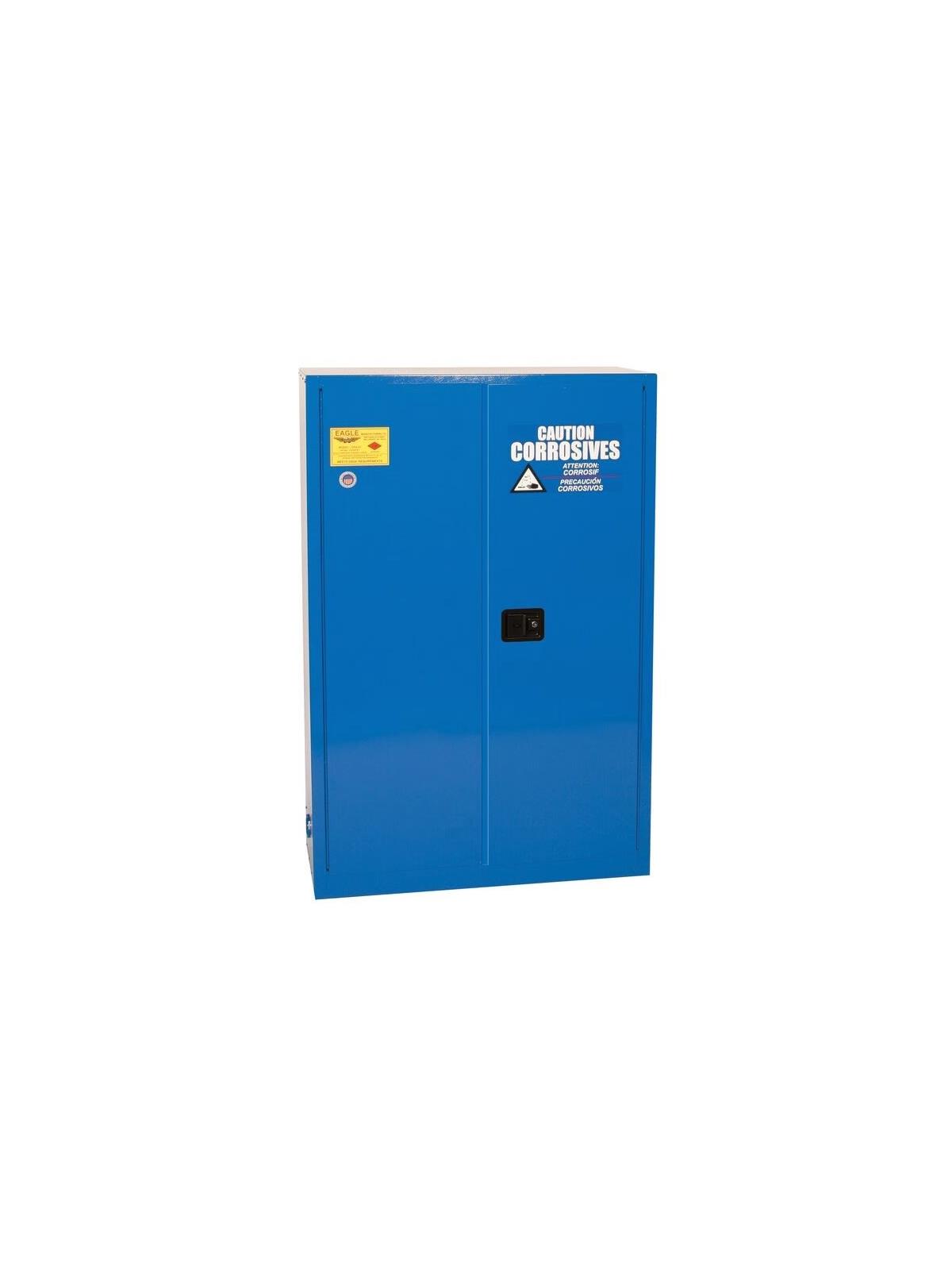 Eagle acid corrosive safety cabinets are constructed of 18-gauge (1mm) steel. They are designed to store small containers of acids and corrosive liquids. All interior and exterior cabinet walls are finished with blue epoxy powder coating for superior protection against chemical corrosion. Each cabinet has high-density polyethylene (HDPE) trays for the shelves, adjustable poly shelves, storage for smaller containers in the doors, lockable doors, internal and top sump capacities, and poly vents with caps. Most of the corrosive safety cabinets are FM approved. FOB Shipping Point.