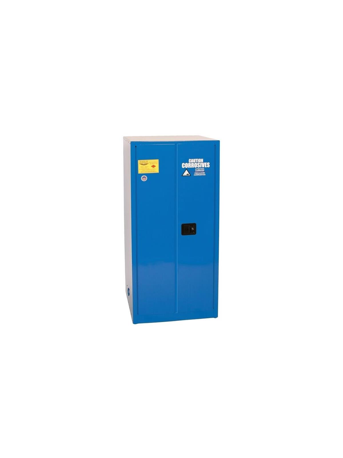 Eagle acid corrosive safety cabinets are constructed of 18-gauge (1mm) steel. They are designed to store small containers of acids and corrosive liquids. All interior and exterior cabinet walls are finished with blue epoxy powder coating for superior protection against chemical corrosion. Each cabinet has high-density polyethylene (HDPE) trays for the shelves, adjustable poly shelves, storage for smaller containers in the doors, lockable doors, internal and top sump capacities, and poly vents with caps. Most of the corrosive safety cabinets are FM approved. FOB Shipping Point.