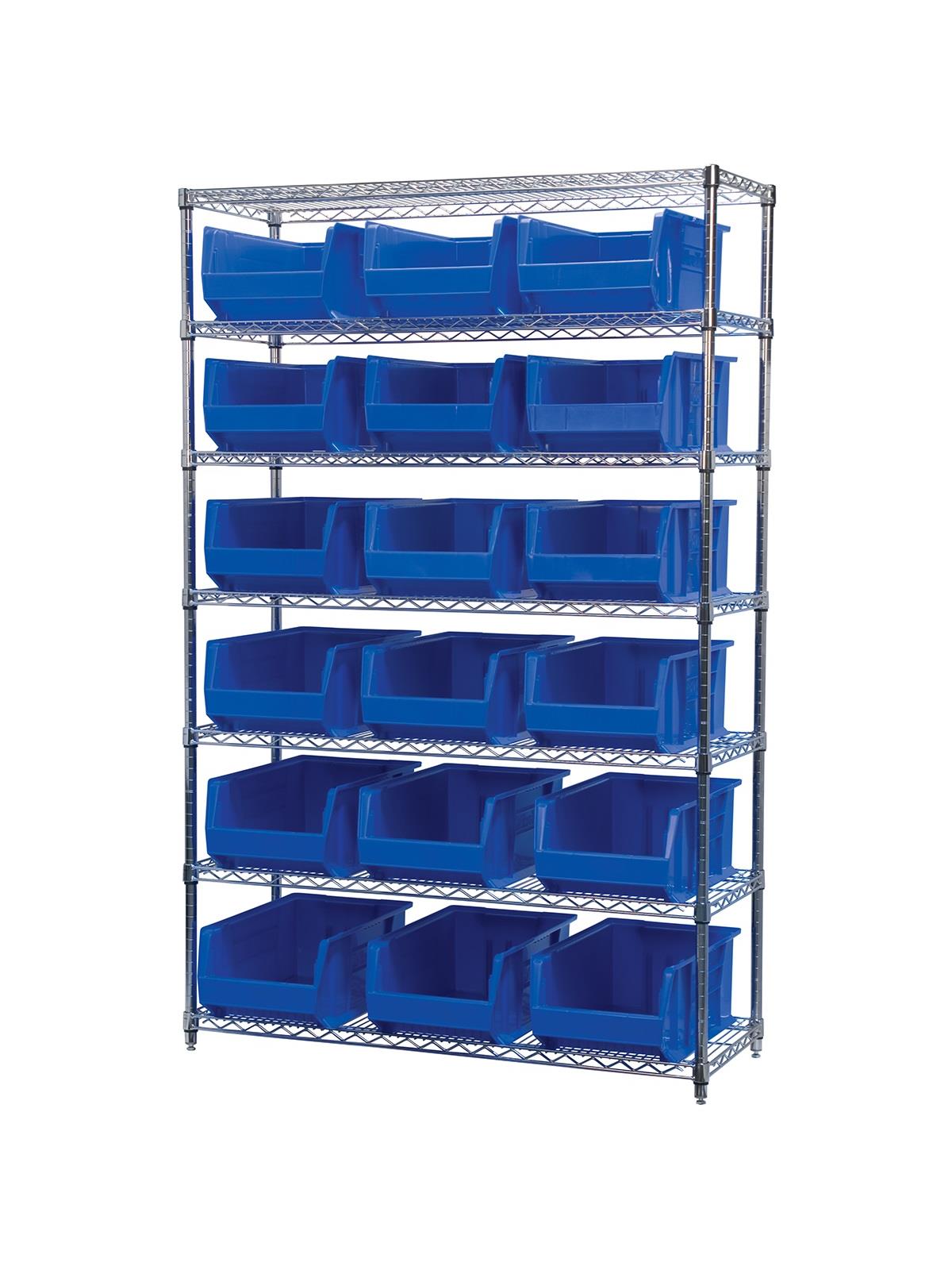 A wide variety of shelf configurations are possible with three sizes of shelving available. Durable AkroBins® feature a curved bottom hopper front, to enable easy access of small parts. Bins available in Blue, Red, Yellow, Stone, Green, or Semi-Clear. FOB Shipping Point.