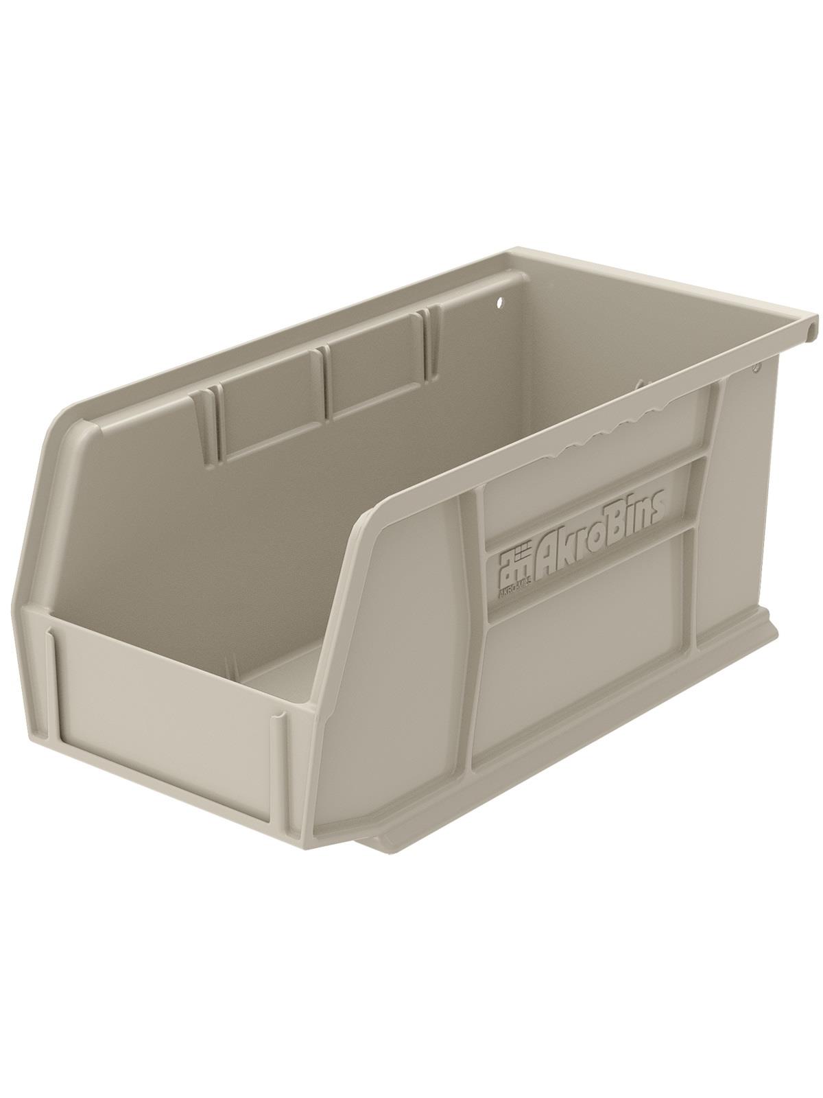 AkroBins are heavy-duty and securely stack on top of each other, sit on shelving, and hang from Akro-Mils racks, panels, rails and carts. Unaffected by weak acids and alkalis the sturdy one piece construction is water, rust and corrosion-proof. Finger grip allows for easy handling. Large label slot for easy identification of contents. Autoclavable up to 250° F. Guaranteed not to crack or break under normal load conditions as stated in the 1-year limited warranty. Optional dividers and labels available, see Related Items tab. AkroBins available in Red, Yellow, Blue, Green, Black, Stone, and Semi-Clear. FOB Shipping Point.
