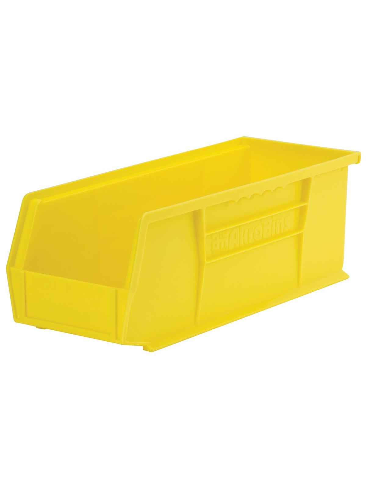AkroBins are heavy-duty and securely stack on top of each other, sit on shelving, and hang from Akro-Mils racks, panels, rails and carts. Unaffected by weak acids and alkalis the sturdy one piece construction is water, rust and corrosion-proof. Finger grip allows for easy handling. Large label slot for easy identification of contents. Autoclavable up to 250° F. Guaranteed not to crack or break under normal load conditions as stated in the 1-year limited warranty. Optional dividers and labels available, see Related Items tab. AkroBins available in Red, Yellow, Blue, Green, Black, Stone, and Semi-Clear. FOB Shipping Point.