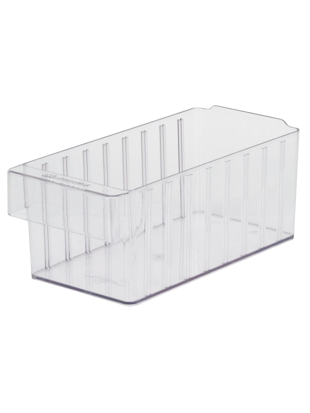 Offered in 12" or 18" depths to work with compatible shelving. Easy to label and color code inventory for quick identification of parts and supplies. Drawers can be stacked to optimize space. Wide front handle for easy gripping when AkroDrawers are loaded or contain heavy contents. Can be used with available shelving, racks, mobile carts or can be used by themselves. Sturdy back stop tab ensures AkroDrawers can hang securely from shelves. Dividers are available to keep contents neatly separated in drawers. Available in Blue, Gray, Yellow, Red and Clear - Minimum order required. FOB Shipping Point.