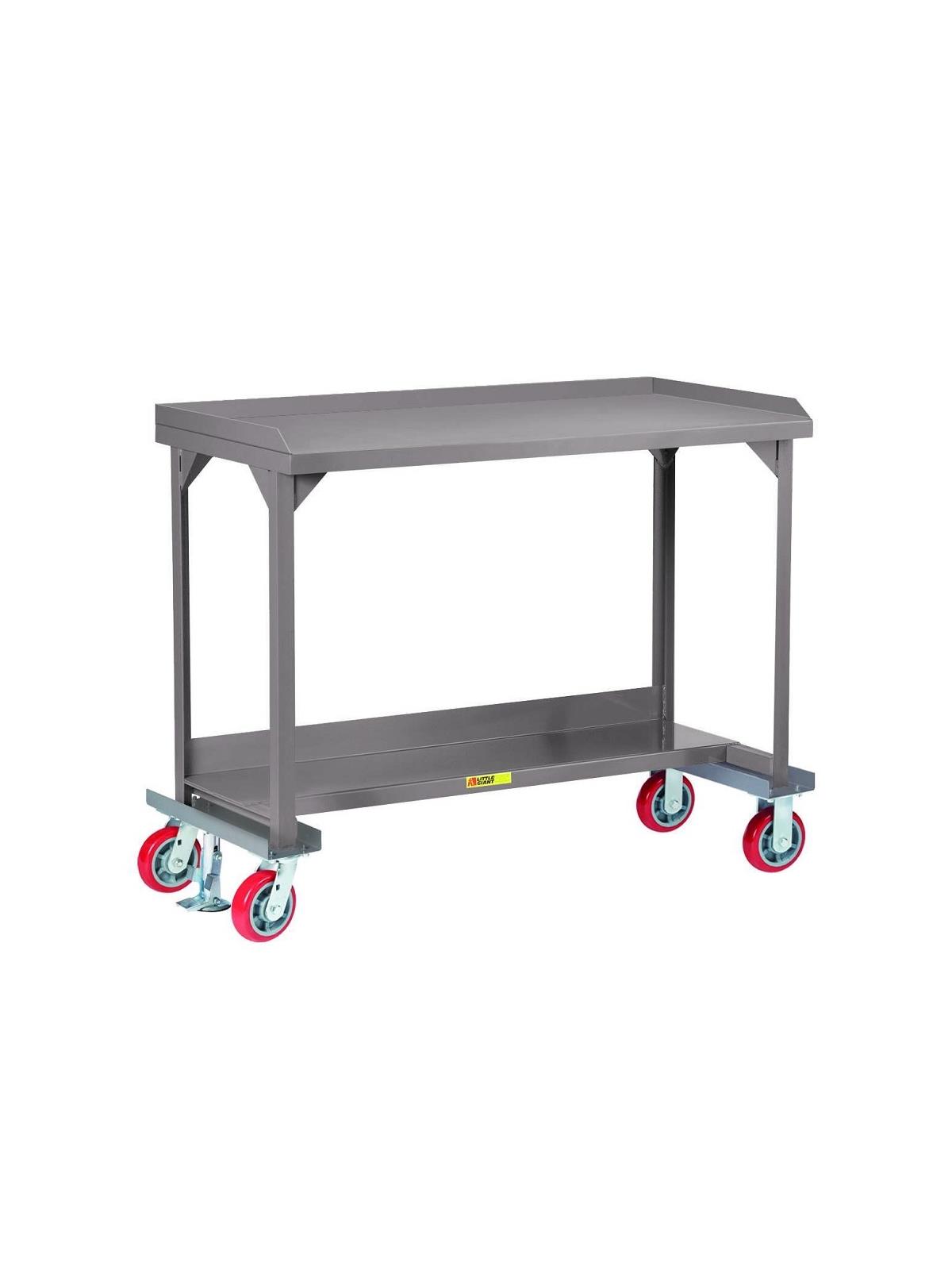 Features a double reinforced, 12 gauge steel top with 1-1/2" raised edge on back and sides. Two rigid and two swivel 6" polyurethane wheels. Floor lock stops unwanted movement. Choose from fixed or adjustable heights. FOB Shipping Point.