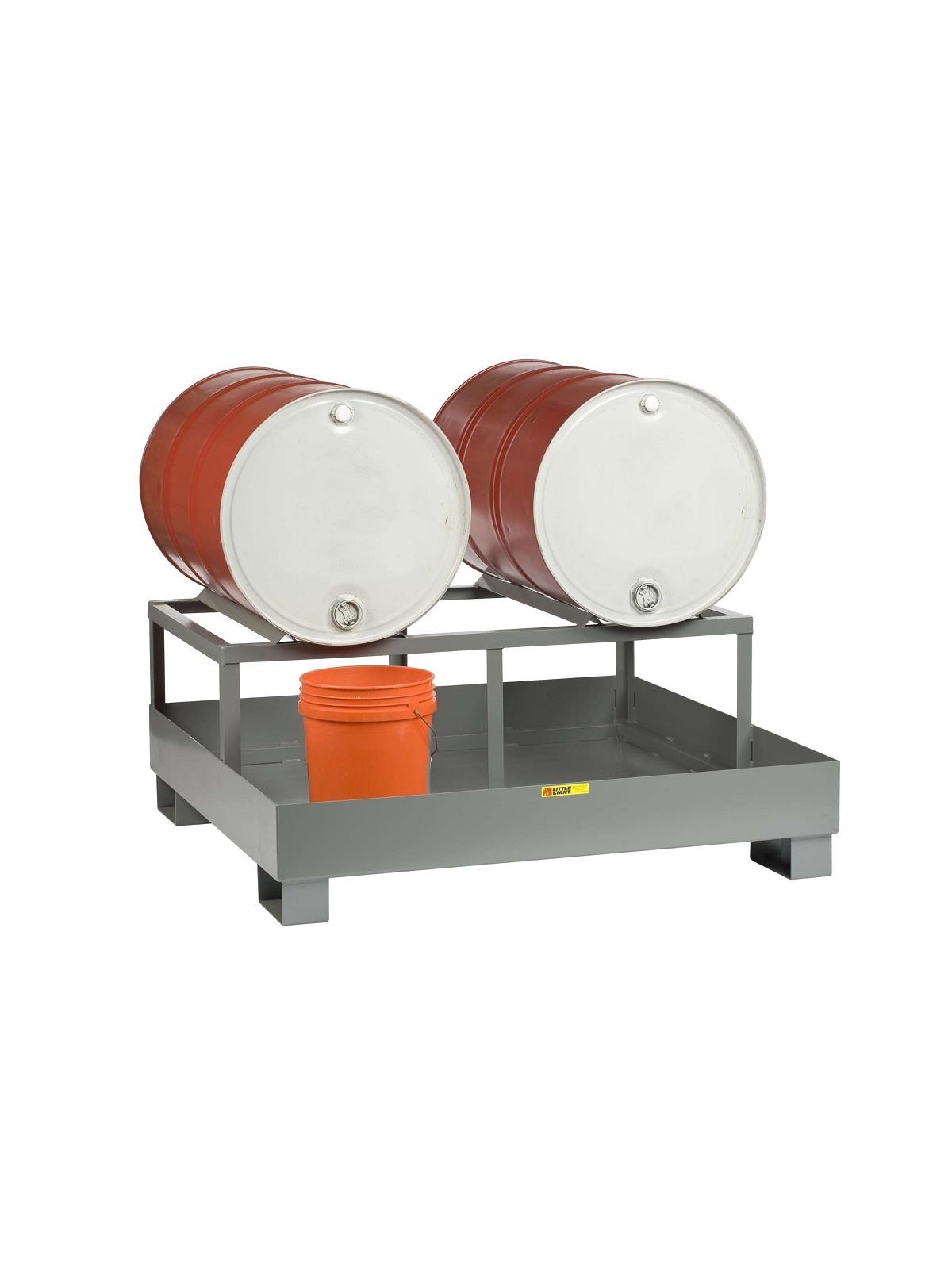 Heavy-gauge steel construction in a drum storage system that positions the drums ready for dispensing. 1-Drum unit has 33 gallon sump capacity and 2-Drum unit has 66 gallon sump capacity. Both include 4 way fork-liftable access. FOB Shipping Point.
