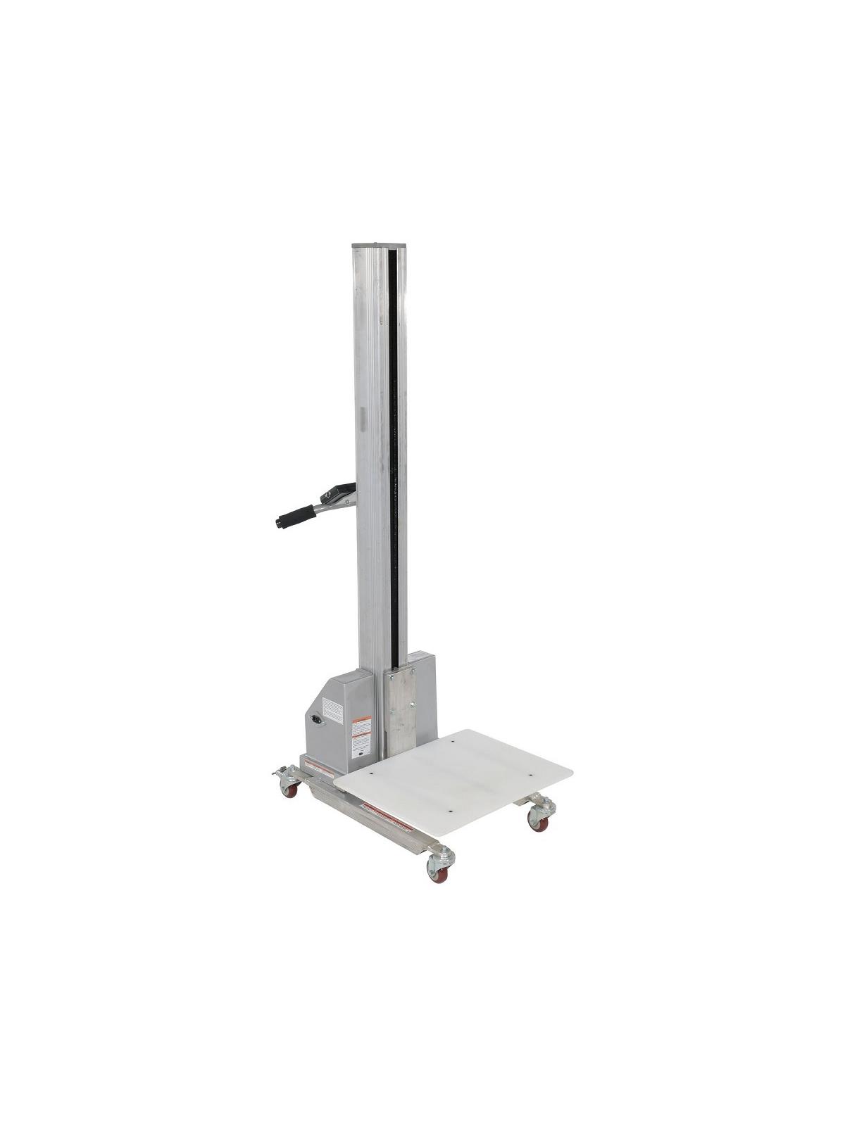 All lift components concealed in lift column -- no dangerous pinch points. Ideal for clean room environments. Virtually maintenance free design. Finger tip lift speed adjustment. Rolls on 3" x 1-1/2" polyurethane wheels -- 2 swivel/lock, 2 swivel. Standard with push button control panel, 115V AC charger. Optional hand held push button control available. FOB Shipping Point.
