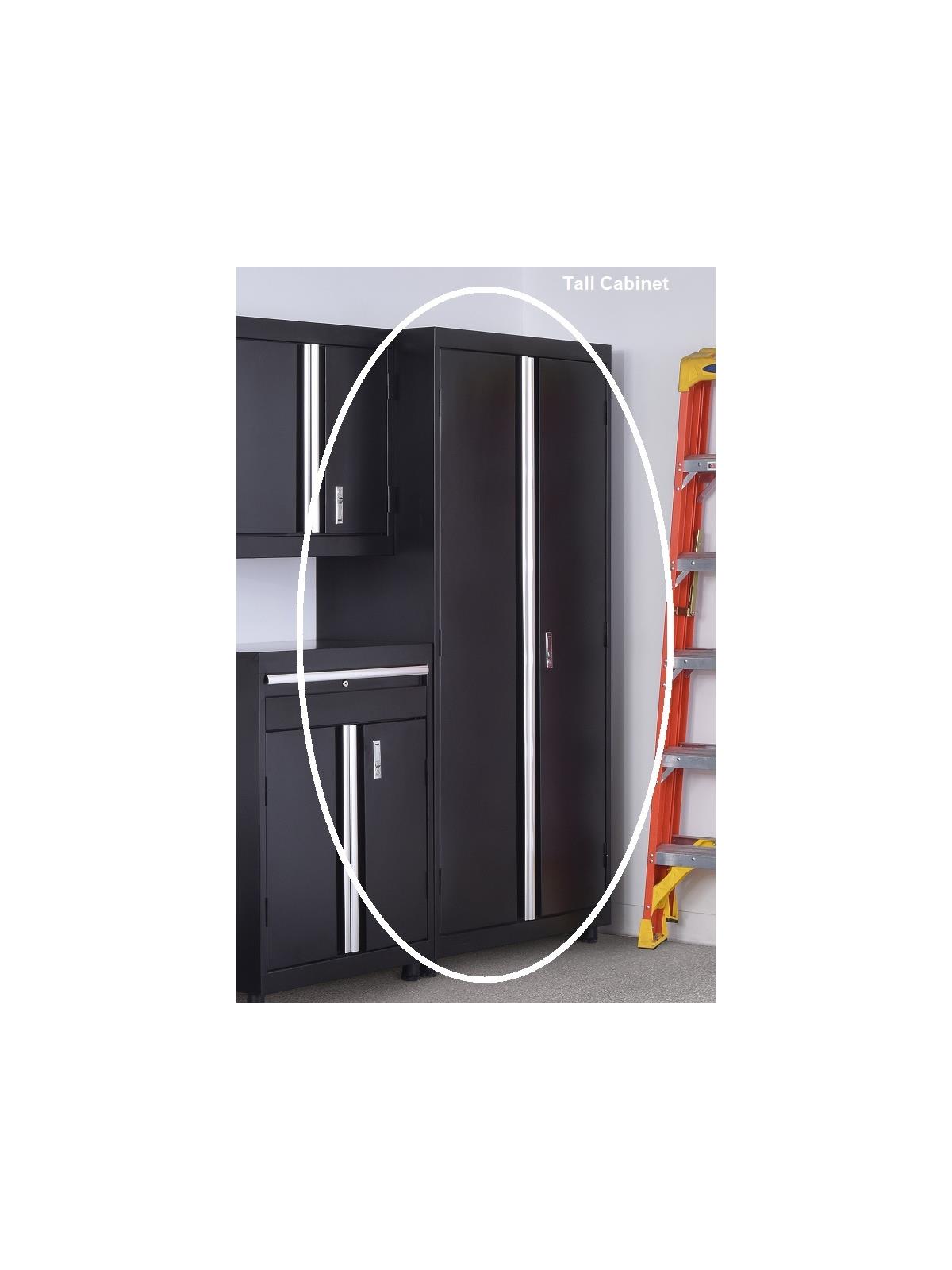 Durable all welded steel construction with durable black finish for lasting protection and beauty. Doors have full-length door pulls and a push button lock to keep cabinet secure. Heavy duty rounded legs with leveling guides to keep cabinets evenly leveled. Shelves adjust on 2" centers to accommodate various size items. 200 lb. capacity shelves; wall cabinet has 150 lb. capacity shelves. Cut-out access holes in back of cabinets allow cords through for charging. Drawer fully extends on ball-bearing slides. FOB Shipping Point.