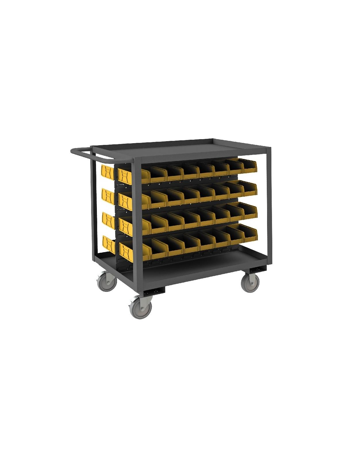 Carts feature 1-1/2" x 1/8" angle iron uprights for added strength. Shelves are heavy duty 14 gauge steel. Sturdy tubular push handle for ease of handling. Durable yellow Hook-On-Bins®. Top surface has 1-1/2" lips up. Louvered center panels accommodate Hook-On-Bins®. Rolls easily on 5" x 1-1/4" polyurethane bolt-on casters, (2) swivel with side brakes and (2) rigid. Ships fully assembled ready to use. Durable, gray, textured powder coat finish. FOB Shipping Point.
