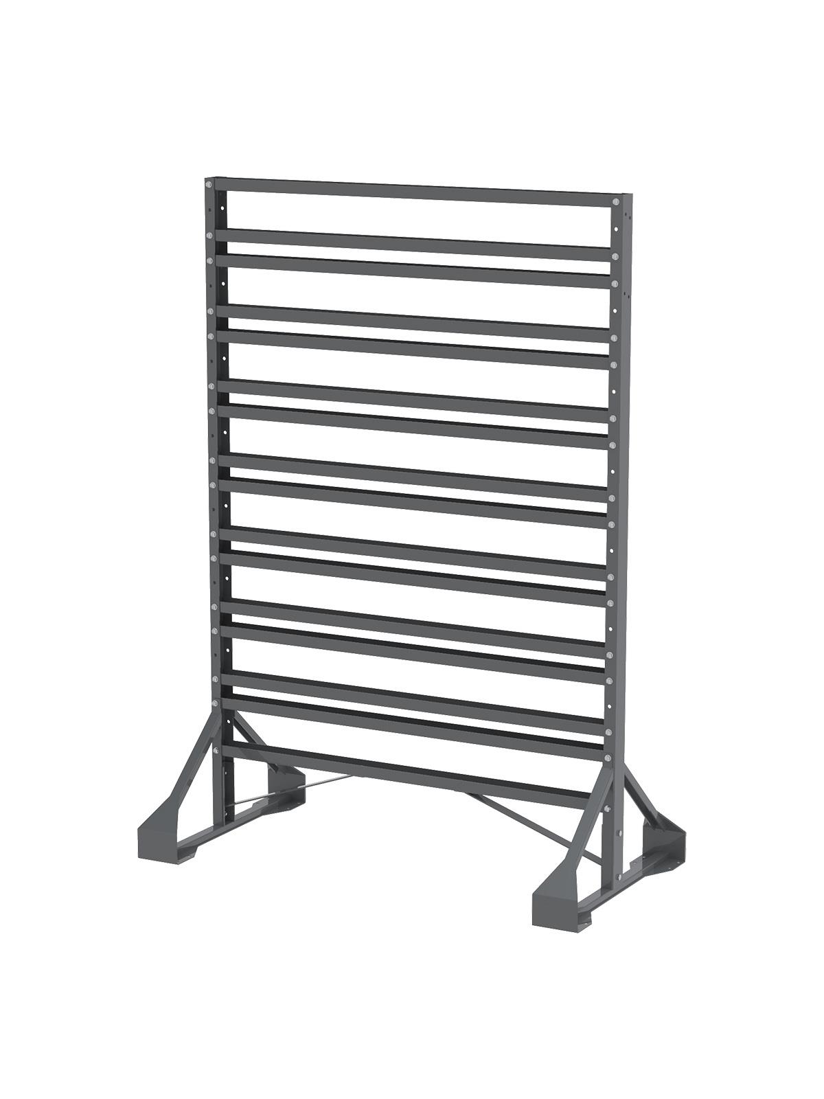 Panels are available in 18" x 36" widths. Two louvered racks available. Two bench racks available that support 120 lbs. Free standing floor rack supports 2000 lbs. Ships by truck. FOB Shipping Point.