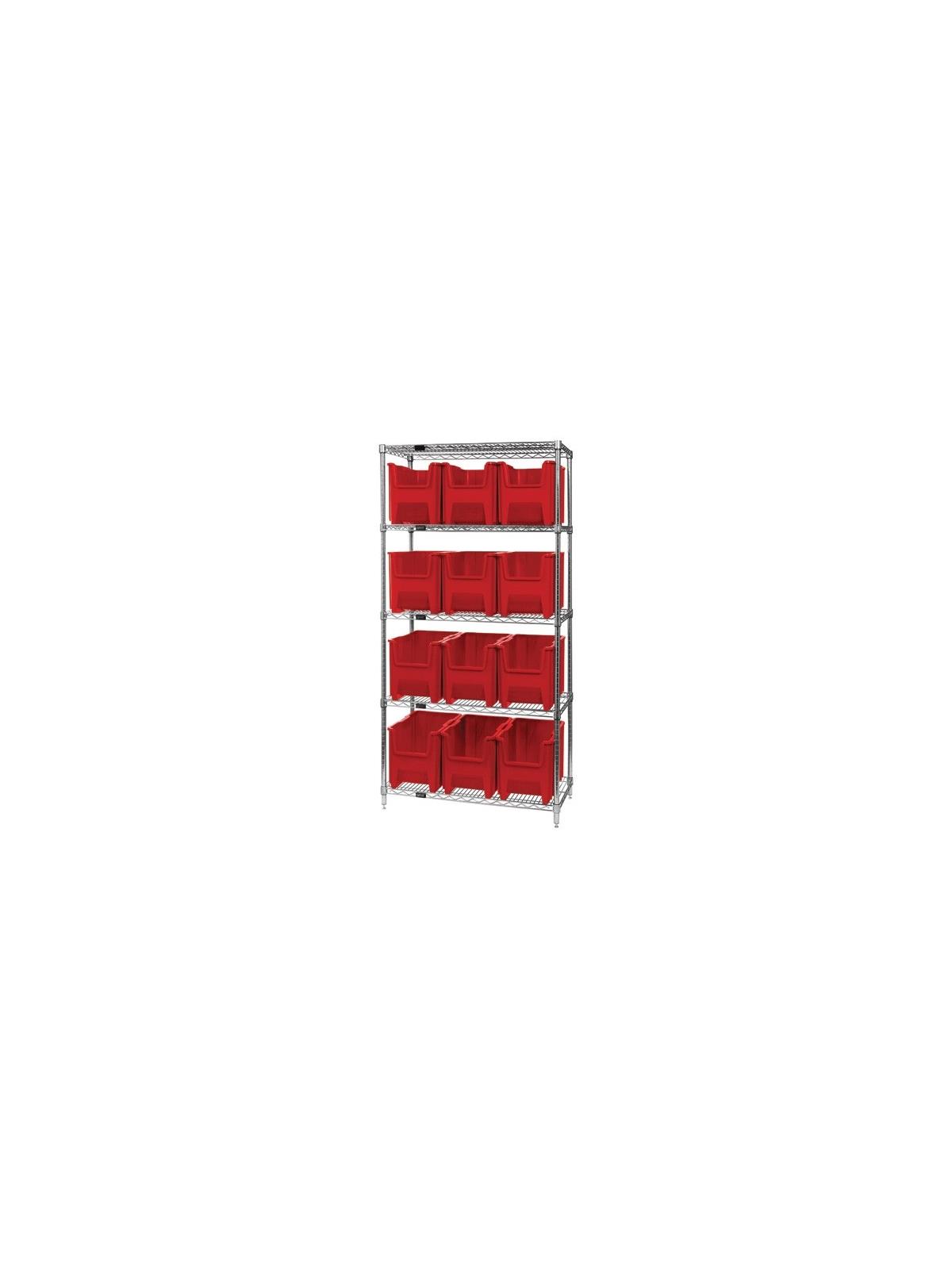 Combine stylish chrome shelving and parts organizing bins. Sturdy shelving unit supports loads up to 800 lbs. Choice of bins. Easy to assemble. Giant Hopper Bins are available in Gray, Blue, or Red. FOB Shipping Point.