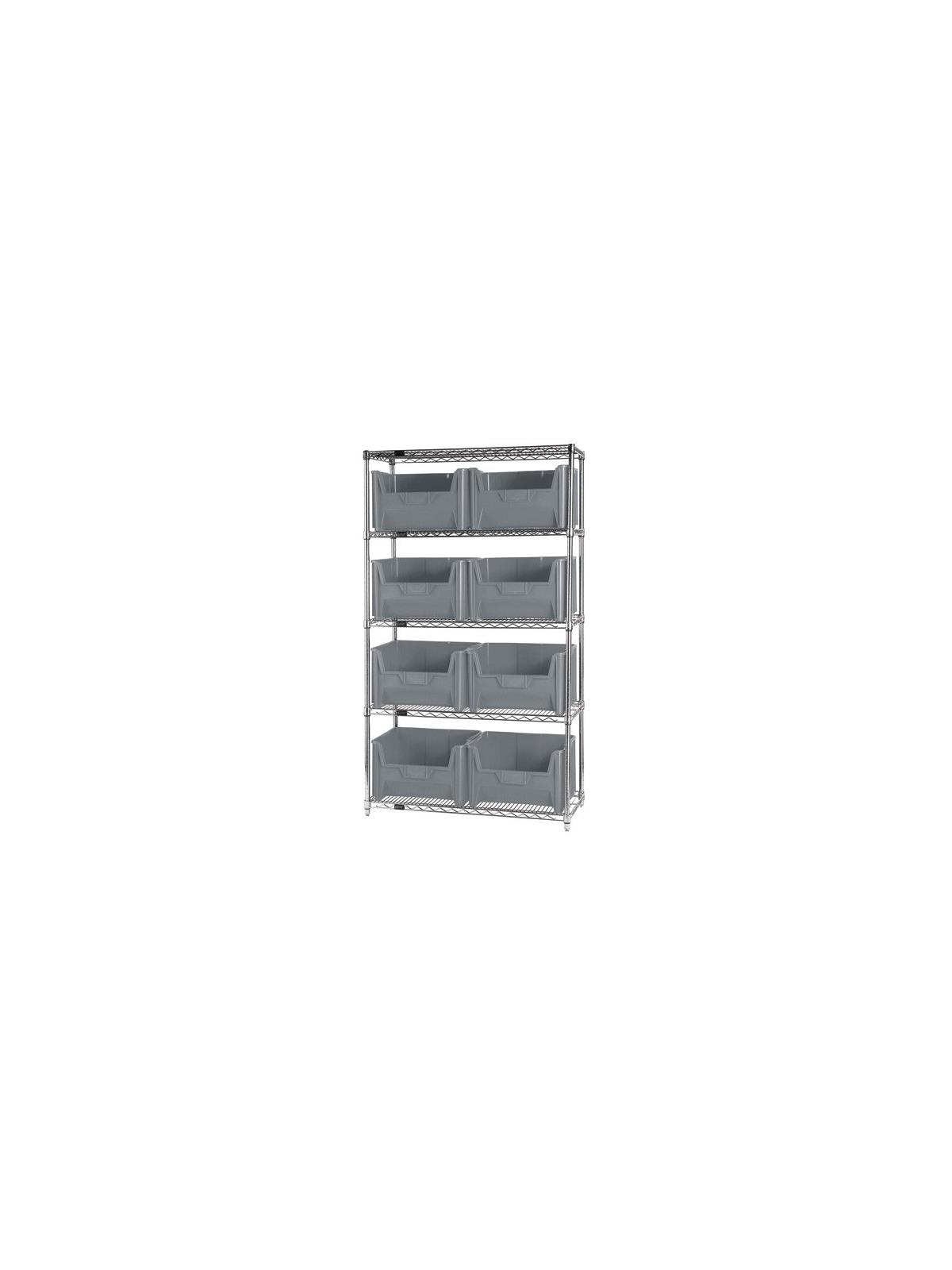 Combine stylish chrome shelving and parts organizing bins. Sturdy shelving unit supports loads up to 800 lbs. Choice of bins. Easy to assemble. Giant Hopper Bins are available in Gray, Blue, or Red. FOB Shipping Point.