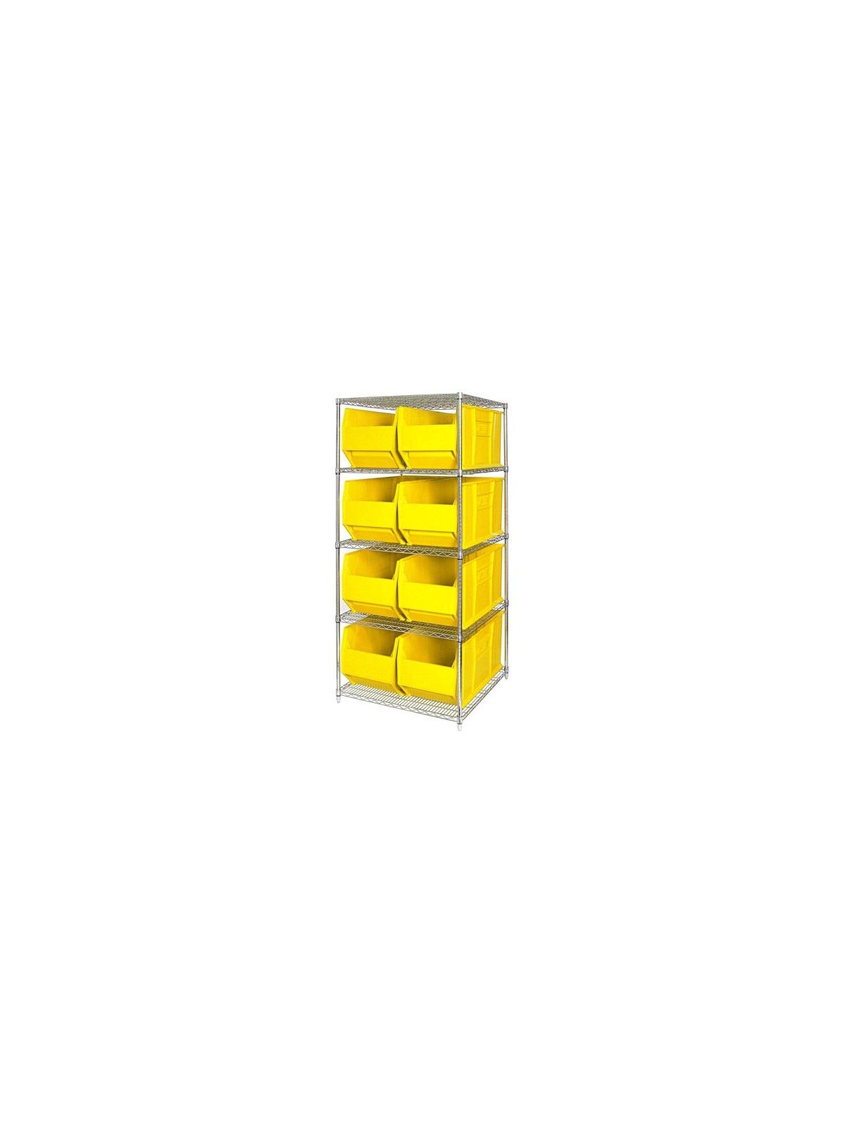 Combine stylish chrome shelving and parts organizing bins. Sturdy shelving unit supports loads up to 800 lbs. Choice of bins. Easy to assemble. Hulk Containers are available in Blue, Red and Yellow. FOB Shipping Point.