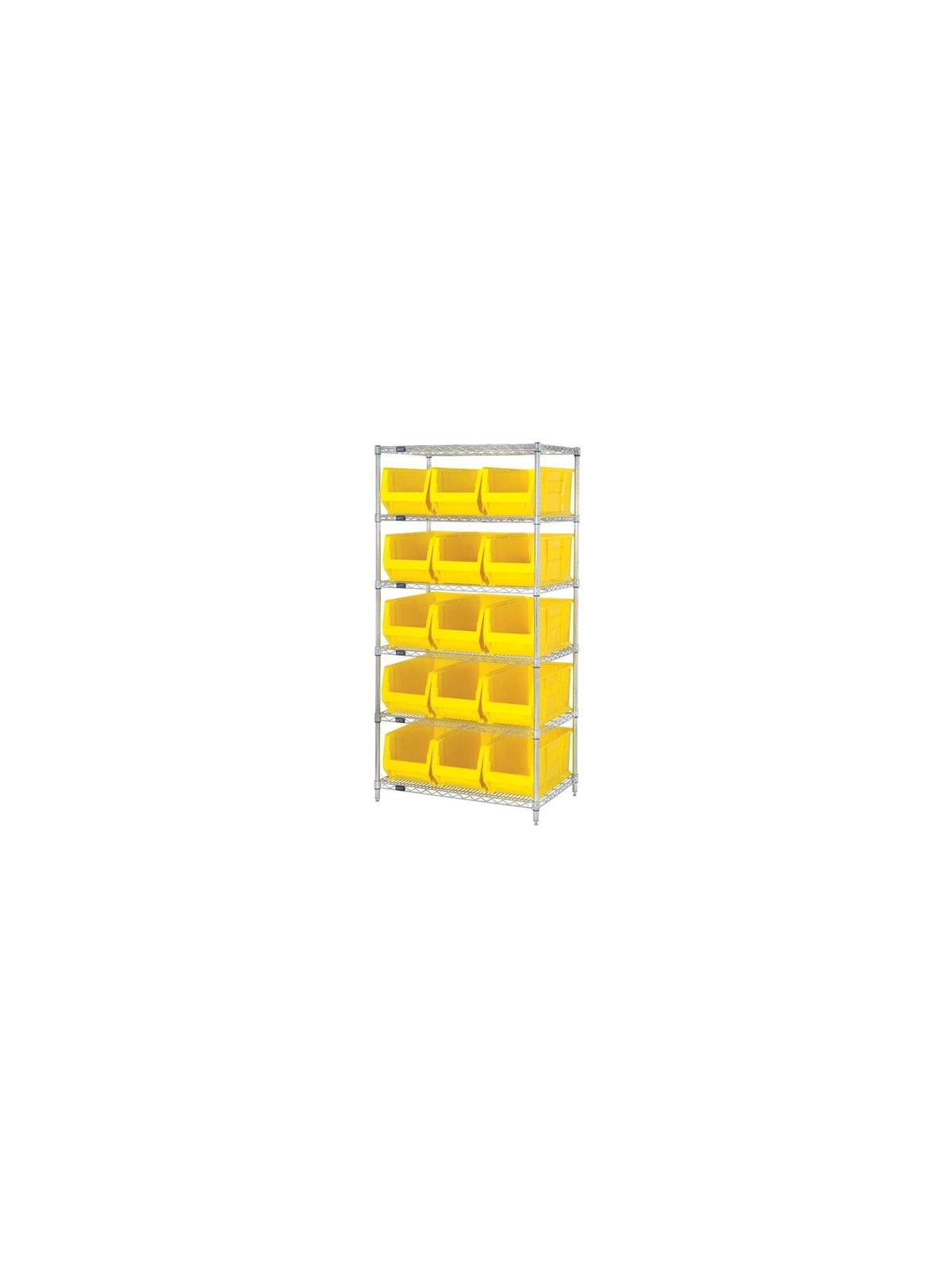 Combine stylish chrome shelving and parts organizing bins. Sturdy shelving unit supports loads up to 800 lbs. Choice of bins. Easy to assemble. Hulk Containers are available in Blue, Red and Yellow. FOB Shipping Point.