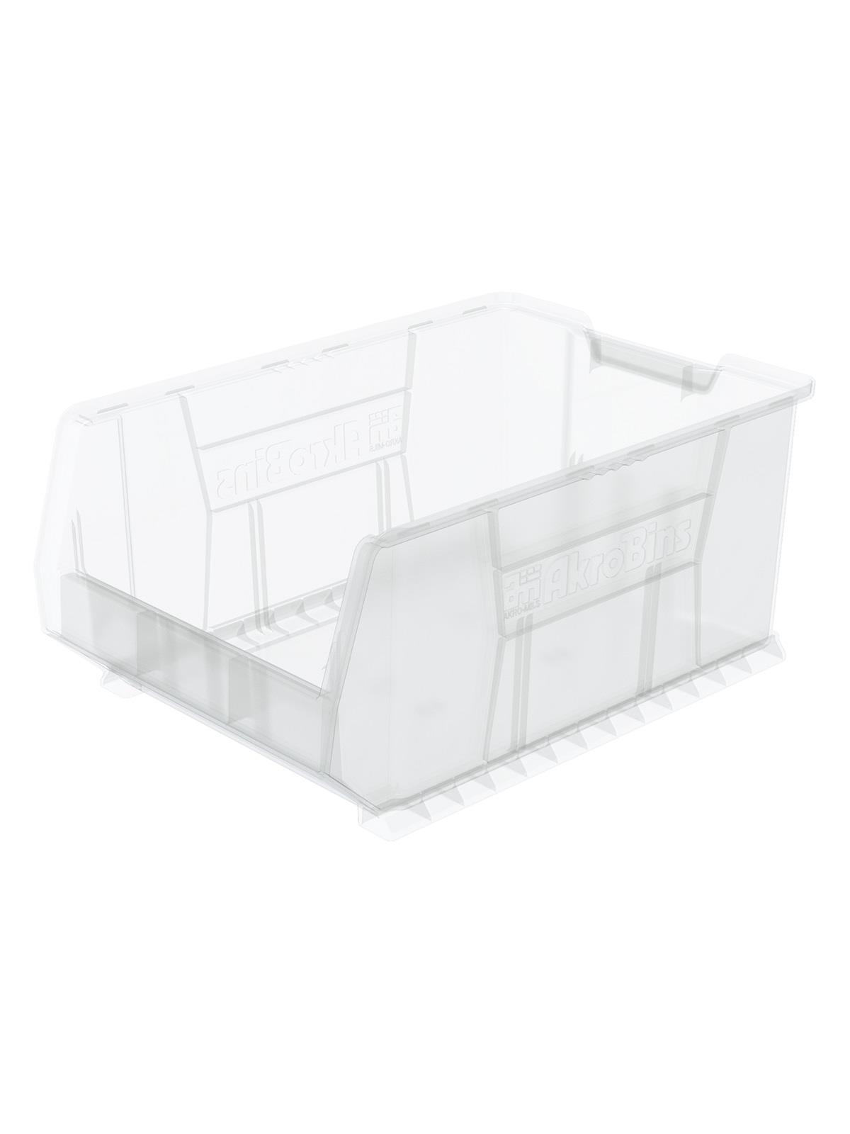 20", 24" and 30" Deep Clear Bins for Super-Size Storage. Large capacity storage bins for organizing heavy or bulky items. Heavy-duty bins molded in clear polypropylene. Extra large stacking containers feature anti-slide stop to prevent bins from shifting forward. Reinforced side ribs add strength and prevent spreading when stacked or loaded. Optional lids and dividers available. FOB Shipping Point.