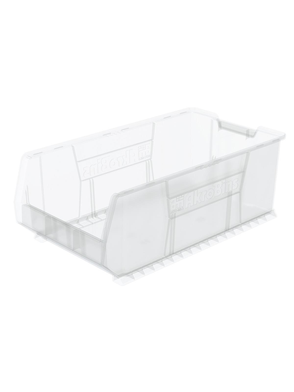 20", 24" and 30" Deep Clear Bins for Super-Size Storage. Large capacity storage bins for organizing heavy or bulky items. Heavy-duty bins molded in clear polypropylene. Extra large stacking containers feature anti-slide stop to prevent bins from shifting forward. Reinforced side ribs add strength and prevent spreading when stacked or loaded. Optional lids and dividers available. FOB Shipping Point.