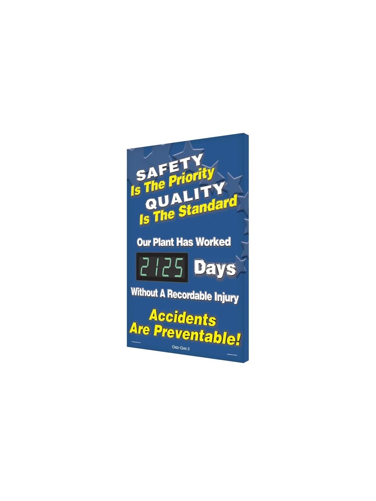 Electronic LED display advances automatically each day, eliminates the hassle of manually updating the safe day numbers. Safety Scoreboard with bright, digital display provides an eye-catching way to inform and alert employees, contractors, and visitors on tracking of safe work days in the workplace, as it counts up. FOB Shipping Point.