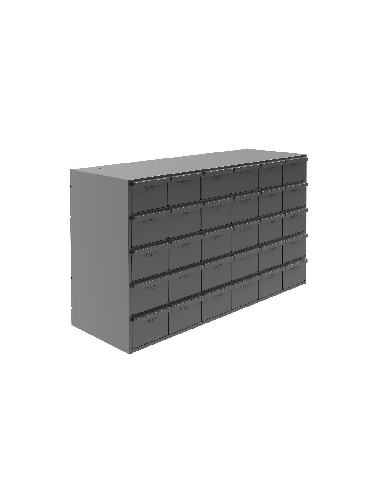 All-welded heavy-duty frame features vertical support for extra stacking strength. A positive stop mechanism prevents drawers from falling out. Drawers also feature double interlocked design for additional rigidity. Full-width handles for a firm grip. Each drawer complete with 2 adjustable dividers. Extra dividers sold below. Fits standard shelving. Finished in rust and acid resistant Gray powder coat. Fully assembled. FOB Shipping Point.