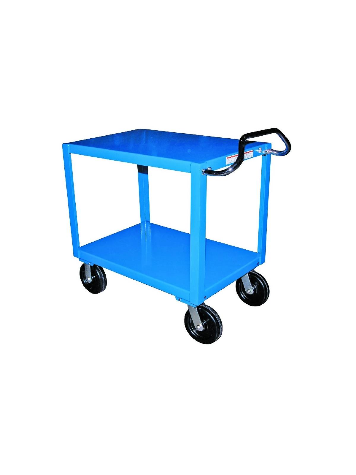 Constructed of heavy-duty steel to handle uniform loads up to 4,000 pounds. The patented ergonomic handle decreases fatigue by allowing the operator to easily maneuver the cart. Handle can be inverted for individual height comfort. Rolls on 8" x 2" casters, two (2) rigid and two (2) swivel with roller bearings. Many caster styles to choose from. Additional sizes available.  FOB Shipping Point.