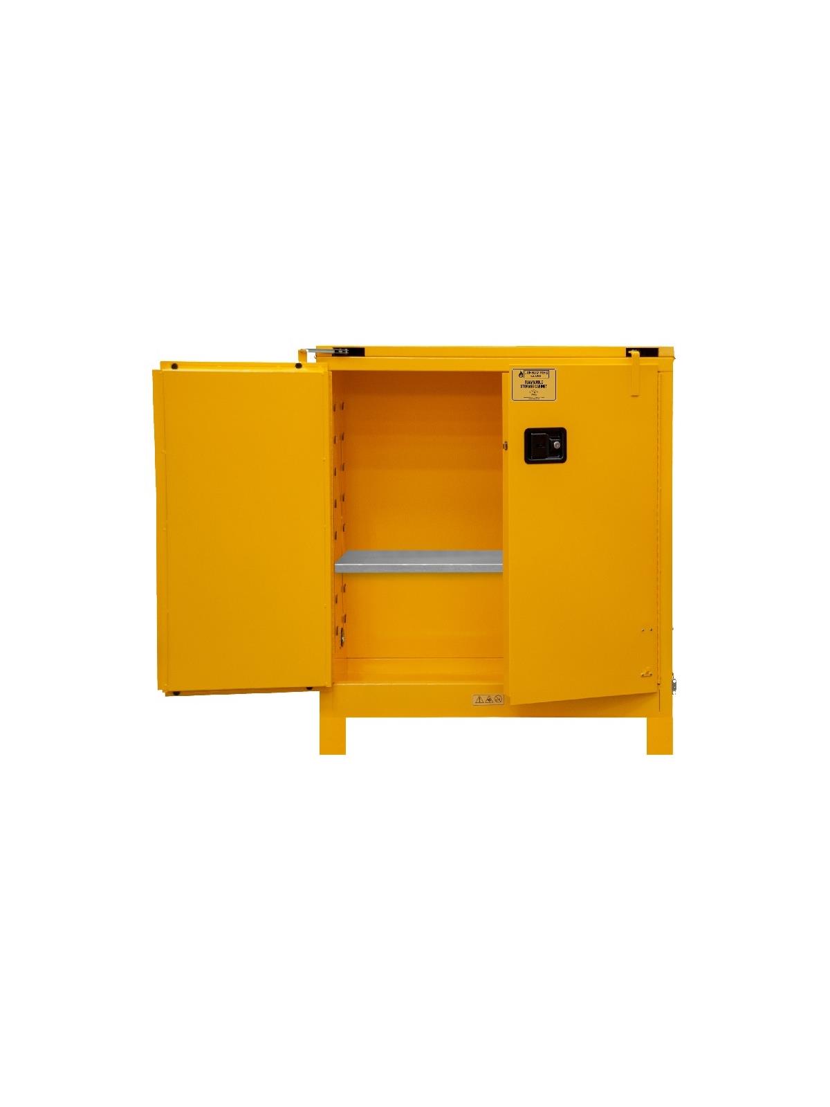 Flammable Storage Cabinets are required by OSHA and UFC in commercial and industrial facilities where flammable liquids are used and stored. Cabinets feature recessed lockable paddle latch and 3 point locking systems which greatly improves security. Bunged air vents on each side of the cabinet allows for greater ventilation. Constructed of all welded Heavy Duty Steel.