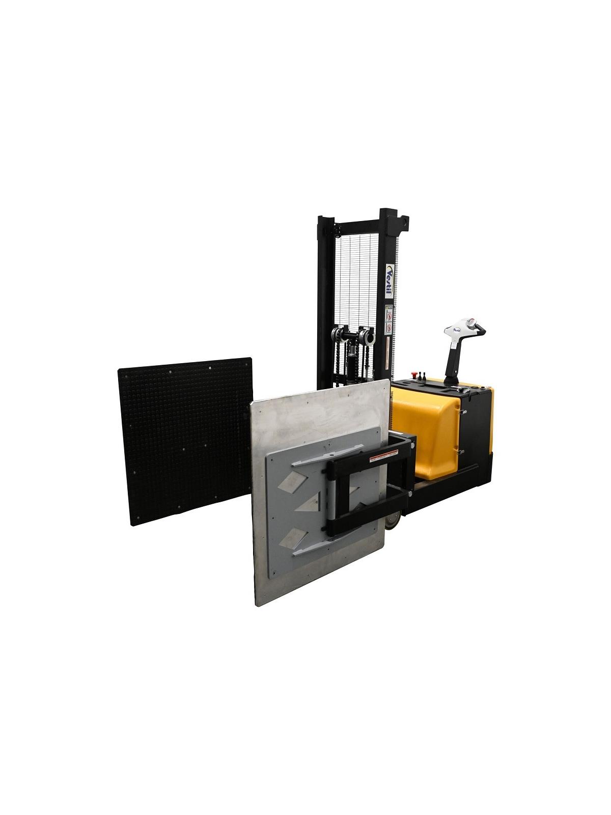 Ergonomic handle/easy-to-operate throttle. Infinite adjustment speeds. Emergency reverses belly switch included. Raised height 52". Ride-on platform. Poly-on-steel steer and load wheels. Powered by two 12V lead acid batteries. 3-4 hour operation at full charge. FOB Shipping Point.