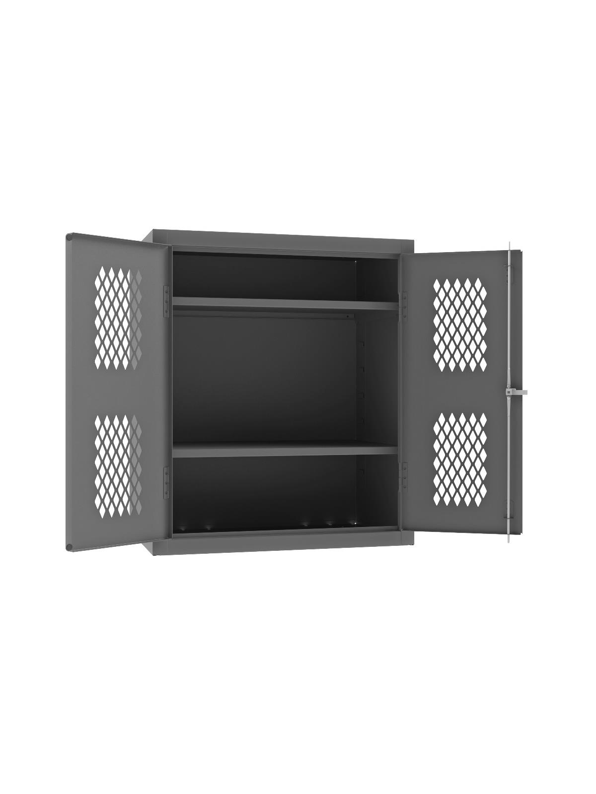 Punched diamond pattern in doors allows content visibility and ventilation. 3-point locking system with keyed handle and lock rods. 4 keys included. Full height, formed and recessed doors with heavy duty, leaf hinges to prevent sagging and warping. Adjustable shelves rest on louvered uprights and adjust on 4" centers (no tools required). Durable, gray, textured powder coat finish. FOB Shipping Point.