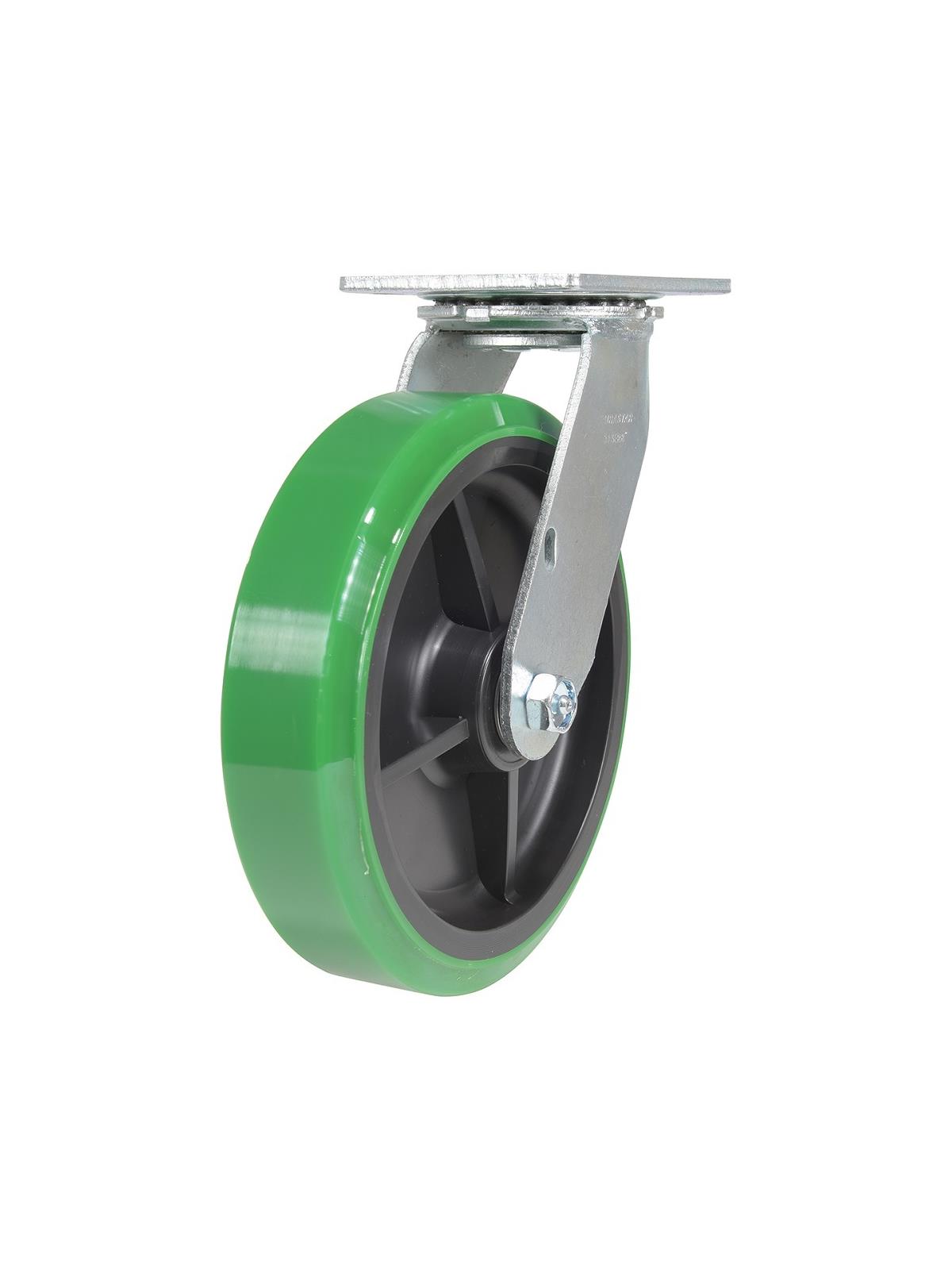 Made of professional grade polyurethane, designed with a new liquid cast flow affusion that ensures a 100% bond to core and 0% trapped air. The unique formula assists in avoiding disintegration that can occur in most plastic wheels, and provides five times longer wheel tread life than standard polyurethane. This caster is resistant to oil, grease, water and most solvents. Top plate size 4" x 4-1/2". FOB Shipping Point.