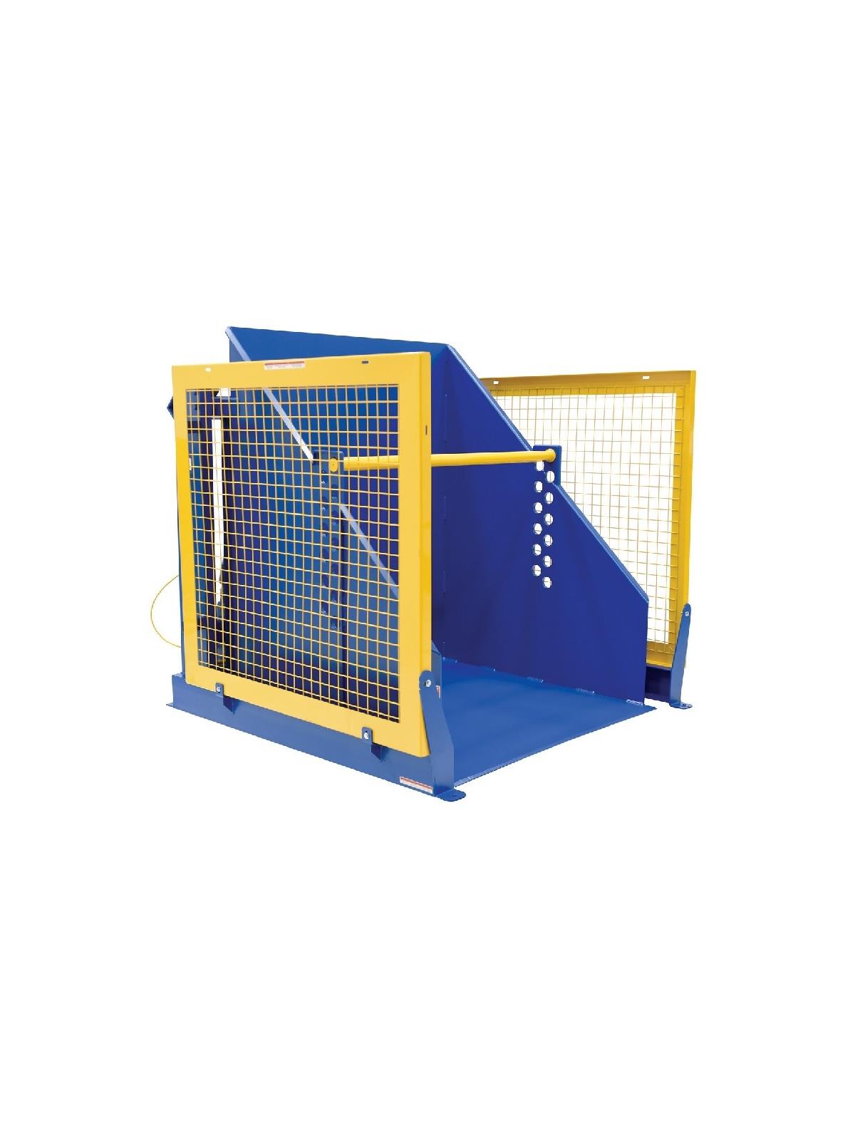 This ultimate dumper has advanced features from solid all welded steel construction to the Emergency Brass Velocity fuse in the cylinder. Main components include a 24V hand held pendant control, 56 frame motor, upper travel limit switch to reduce wear on the components. Safety features include: side rail guards, floor hold down brackets, adjustable hold down bar, 3,000 psi hydraulic component rating, integrated brass velocity fuse mounted inside the cylinder. Maximum rotation is 135°, yielding a 45° dump angle. Painted Royal Blue. FOB Shipping Point.