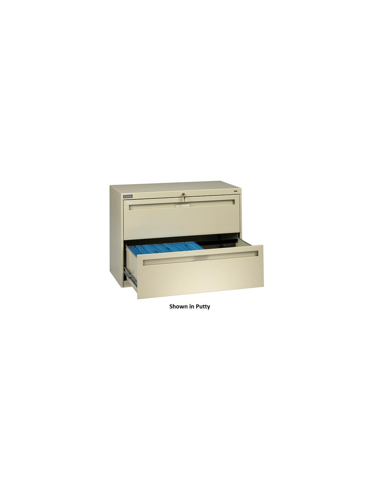 Drawers and doors have easy grip, full-width pulls with recessed label holders. Four leveling glides allow the unit to be leveled on uneven floors. To reduce risk of tipping, order two drawer lateral files with counterweights (suffix "W") for all applications except under a work surface in a workstation. Five and six-high units have retractable door(s) with roll-out drawer on top opening(s). Durable powder-coat paint finish. Available in Light Gray, Medium Gray, Putty, Sand and Black. FOB Shipping Point.