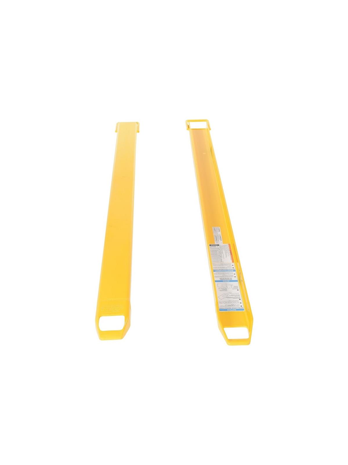 Rugged and durable welded steel construction with cast steel fork tips. Steel retaining strap prevents fork extensions from sliding off forks during use. Extensions are put on by sliding them up the fork at a 45° angle. OSHA regulations require that extensions are no more than 150% of the existing fork length. Powder coat Yellow finish. FOB Shipping Point.