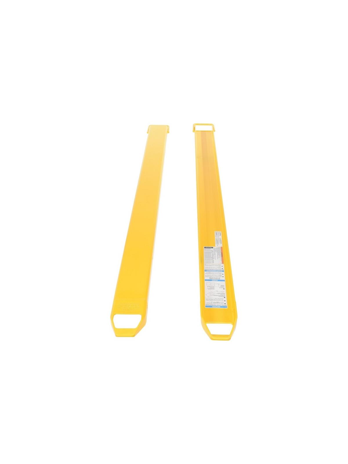 Rugged and durable welded steel construction with cast steel fork tips. Steel retaining strap prevents fork extensions from sliding off forks during use. Extensions are put on by sliding them up the fork at a 45° angle. OSHA regulations require that extensions are no more than 150% of the existing fork length. Powder coat Yellow finish. FOB Shipping Point.