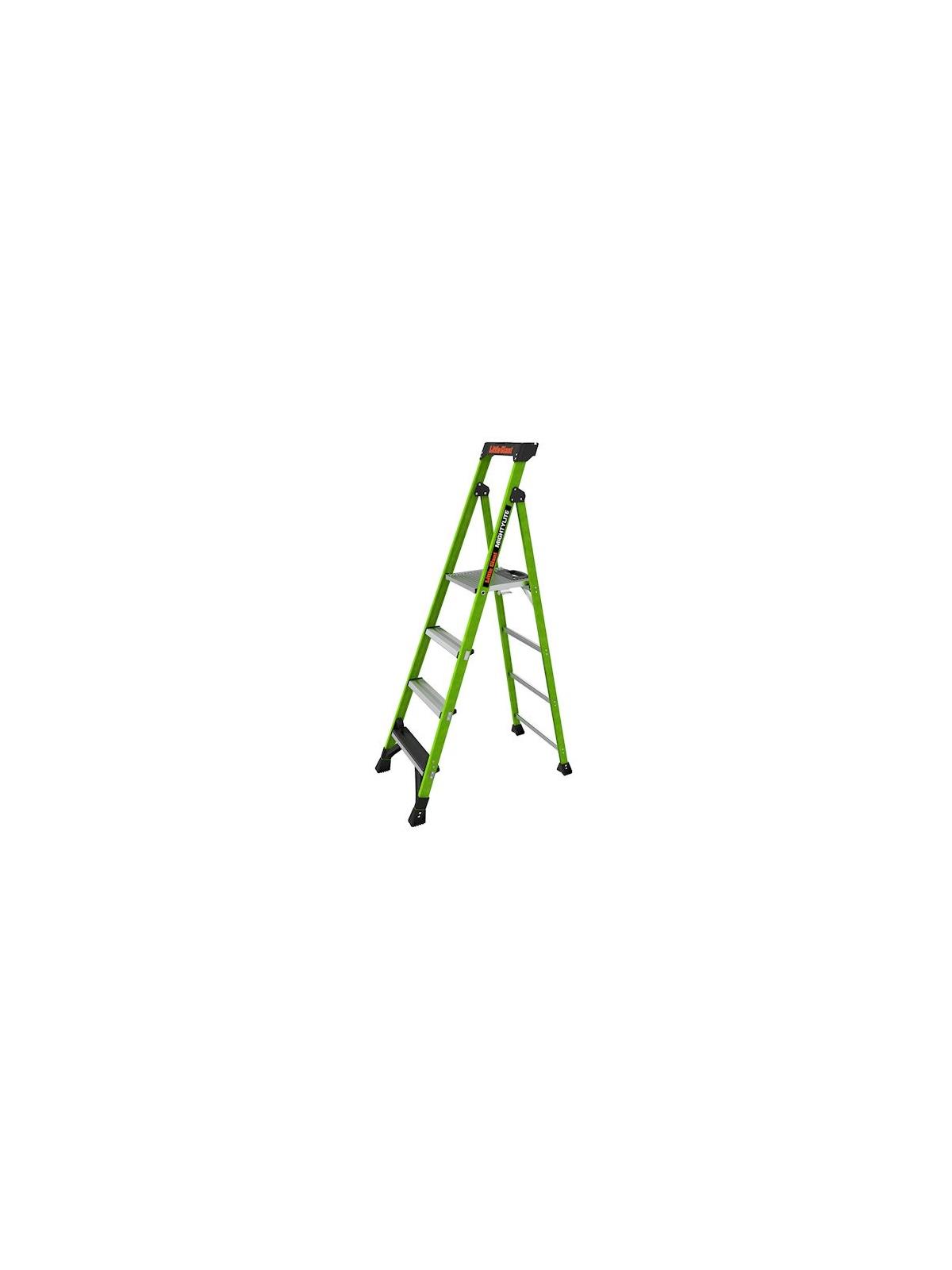 The Mightylite's patented-pending Ground Cue prevents injuries by signaling the user when it is safe to dismount the Ladder.  No-pinch platform design opens easily from a slim 4" storage profile and offers wide comfortable treads on each rung, with a spacious, comfortable standing deck.  Its innovative top cap allows you to keep all of your tools close at hand.  Designed to address the three leading types of stepladder injuries: painful body injuries from carrying heavy equipment, dangerous falls from standing on the top rung and ankle, knee and back injuries from missing the bottom rung. Available in both type IA (300 lbs.) and type IAA (375 lbs.) ratings. FOB Shipping Point.