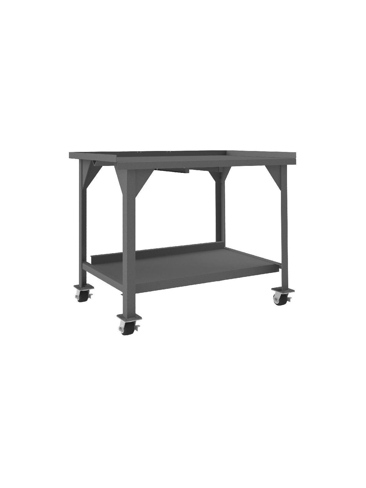 Workbench top is 12 gauge thick reinforced steel. Has angle iron stiffener under work surface and 2" x 2" x 1/4" angle iron legs. Mobile units (DWBM) include (4) 3" phenolic, locking swivel casters. Back and end stops. All units have provisions for optional drawer to be added. Work surfaces are 34" above the floor. All models include a 12 gauge steel lower shelf with 500 lbs. capacity. Foot pads with predrilled holes allow for lagging to the floor. FOB Shipping Point.