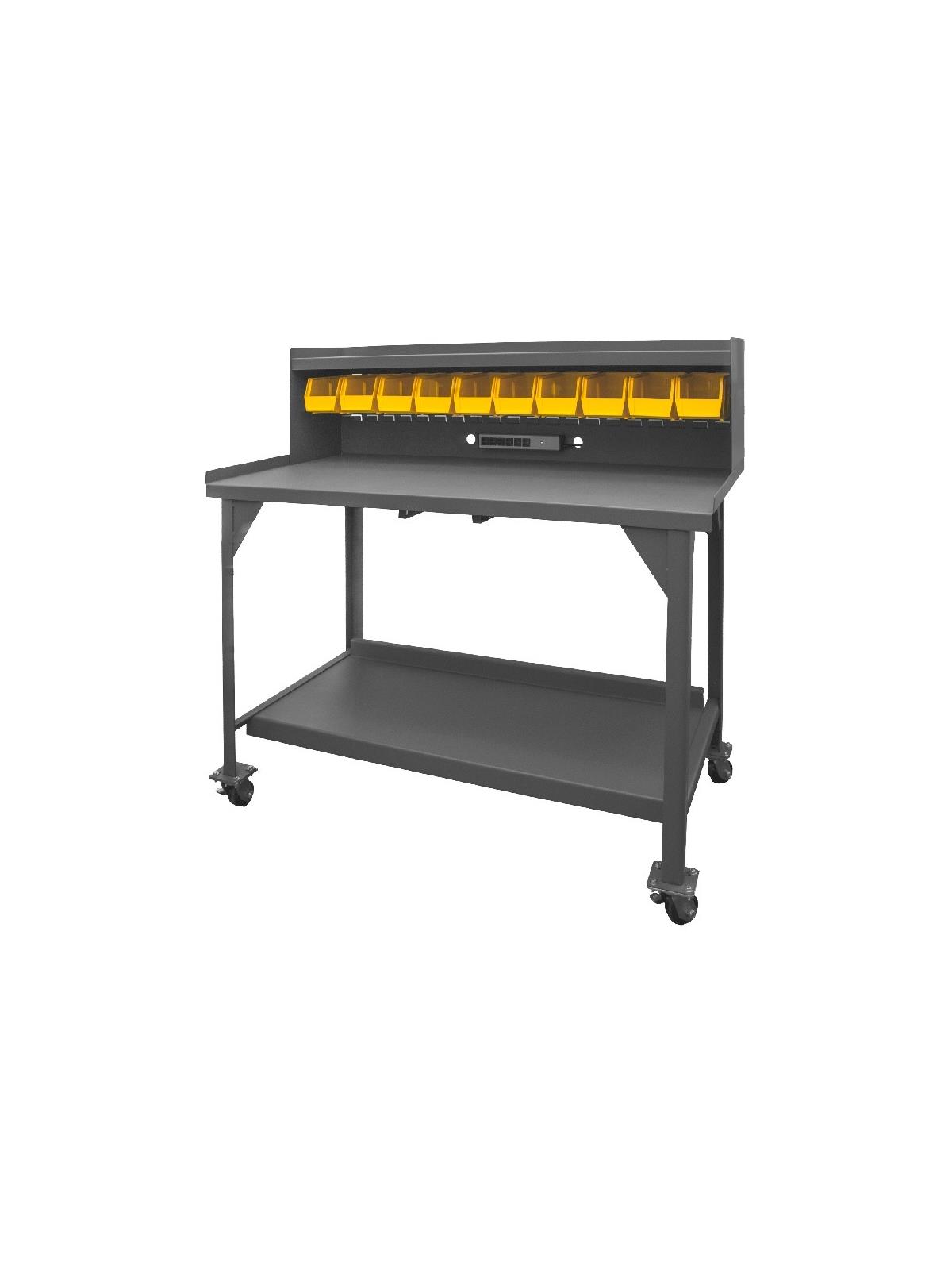 Workbench top is 12 gauge thick reinforced steel. Has angle iron stiffener under work surface and 2" x 2" x 1/4" angle iron legs. Mobile units (DWBM) include (4) 3" phenolic, locking swivel casters. Back and end stops. All units have provisions for optional drawer to be added. Work surfaces are 34" above the floor. All models include a 12 gauge steel lower shelf with 500 lbs. capacity. Foot pads with predrilled holes allow for lagging to the floor. FOB Shipping Point.